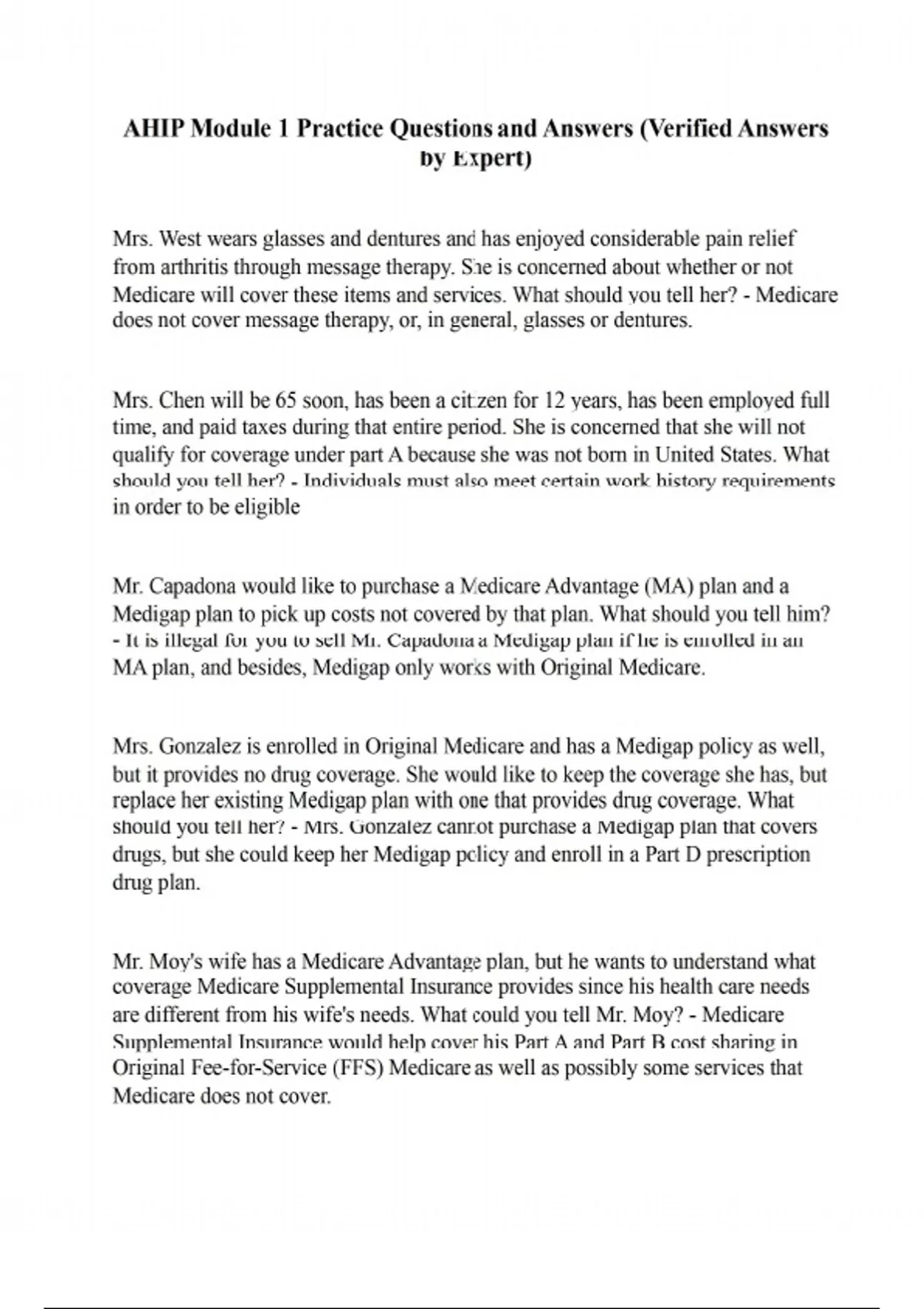 Mrs. West wears glasses and dentures and has enjoyed considerable pain relief from arthritis through message therapy. She is concerned about whether or not Medicare will cover these items and services. What should you tell her? - Medicare does not cover message therapy, or, in general, glasses or dentures. Mrs. Chen will be 65 soon, has been a citizen for 12 years, has been employed full time, and paid taxes during that entire period. She is concerned that she will not qualify for coverage under part A because she was not born in United States. What should you tell her? - Individuals must also meet certain work history requirements in order to be eligible Mr. Capadona would like to purchase a Medicare Advantage (MA) plan and a Medigap plan to pick up costs not covered by that plan. What should you tell him? - It is illegal for you to sell Mr. Capadona a Medigap plan if he is enrolled in an MA plan, and besides, Medigap only works with Original Medicare. Mrs. Gonzalez is enrolled in Original Medicare and