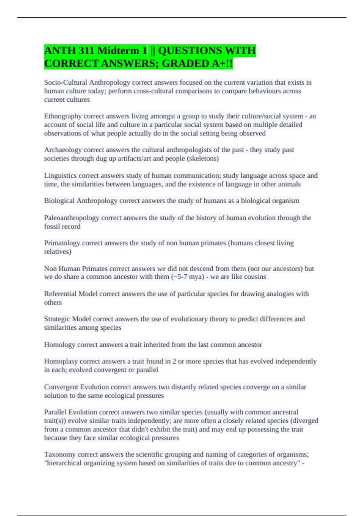 Socio-Cultural Anthropology correct answers focused on the current variation that exists in human culture today; perform cross-cultural comparisons to compare behaviours across current cultures Ethnography correct answers living amongst a group to study their culture/social system - an account of social life and culture in a particular social system based on multiple detailed observations of what people actually do in the social setting being observed Archaeology correct answers the cultural anthropologists of the past - they study past societies through dug up artifacts/art and people (skeletons) Linguistics correct answers study of human communication; study language across space and time, the similarities between languages, and the existence of language in other animals Biological Anthropology correct answers the study of humans as a biological organism Paleoanthropology correct answers the study of the history of human evolution through the fossil record Primatology correct answers the study of non human primates (humans closest living relatives) Non Human Primates correct answers we did not descend from them (not our ancestors) but we do share a common ancestor with them (~5-7 mya) - we are like cousins Referential Model correct answers the use of particular species for drawing analogies with others Strategic Model correct answers the use of evolutionary theory to predict differences and similarities among species Homology correct answers a trait inherited from the last common ancestor Homoplasy correct answers a trait found in 2 or more species that has evolved independently in each; evolved convergent or parallel Convergent Evolution correct answers two distantly related species converge on a similar solution to the same ecological pressures Parallel Evolution correct answers two similar species (usually with common ancestral trait(s)) evolve similar traits independently; are more often a closely related species (diverged from a common ancestor that didn't exhibit the trait) and may end up possessing the trait because they face similar ecological pressures Taxonomy correct answers the scientific grouping and naming of categories of organisms; "hierarchical organizing system based on similarities of traits due to common ancestry" -