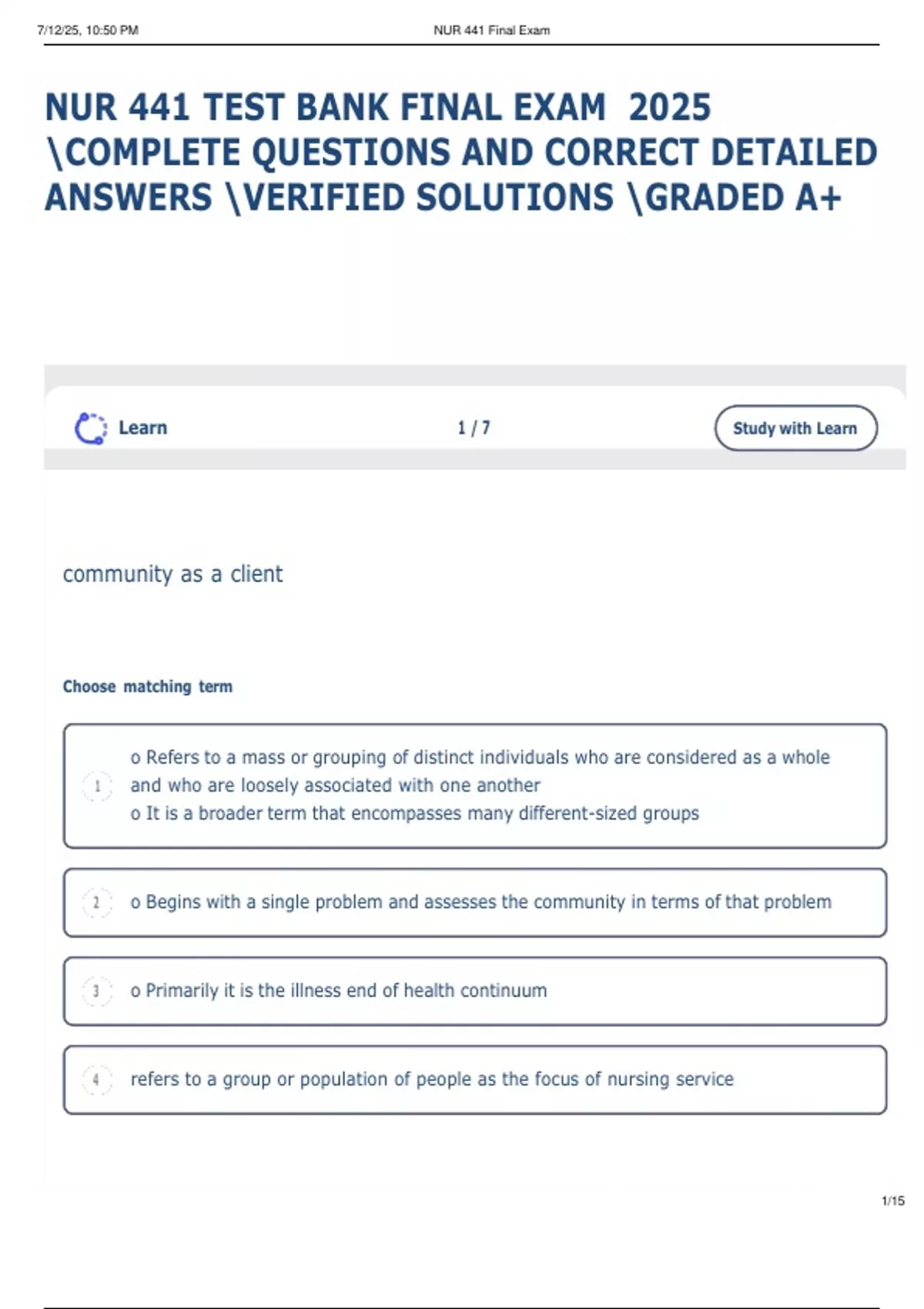 , 7/12/25, 10:50 PM NUR 441 Final Exam