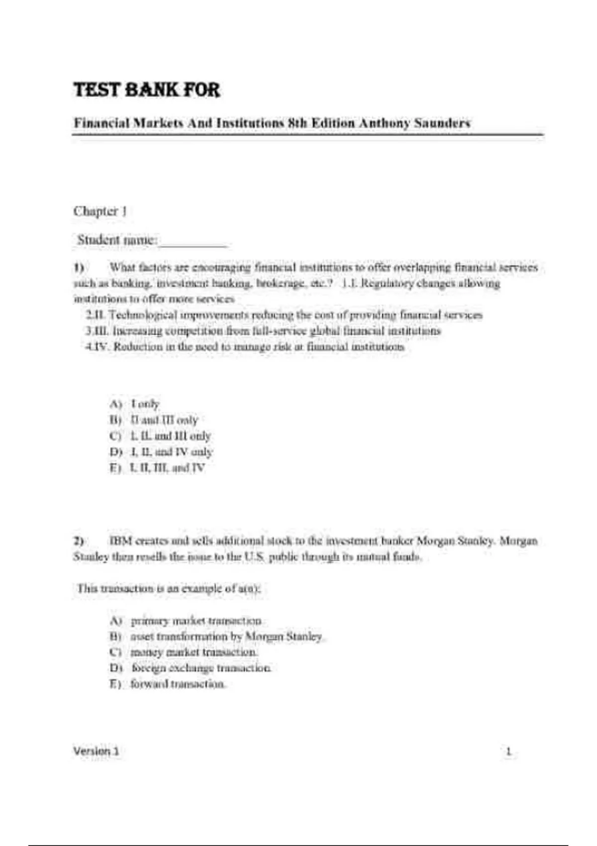 TEST BANK FOR Financial Markets And Institutions 8th Edition Anthony Saunders Chapter 1 Student name:__________ 1) What factors are encouraging financial institutions to offer overlapping financial services such as banking, investment banking, brokerage, etc.? 1.I. Regulatory changes allowing institutions to offer more services 2.II. Technological improvements reducing the cost of providing financial services 3.III. Increasing competition from full-service global financial institutions 4.IV. Reduction in the need to manage risk at financial institutions A) I only B) II and III only C) I, II, and III only D) I, II, and IV only E) I, II, III, and IV 2) IBM creates and sells additional stock to the investment banker Morgan Stanley. Morgan Stanley then resells the issue to the U.S. public through its mutual funds. This transaction is an example of a(n): A) primary market transaction. B) asset transformation by Morgan Stanley. C) money market transaction. D) foreign exchange transaction. E) forward transaction. Version 1 1 3) IBM creates and sells additional stock to the investment banker Morgan Stanley. Morgan Stanley then resells the issue to the U.S. public through its mutual funds. Morgan Stanley is acting as a(n) A) asset transformer. B) asset broker. C) government regulator. D) foreign service representative. E) derivatives trader. 4) A corporation seeking to sell new equity securities to the public for the first time in order to raise cash for capital investment wo ...