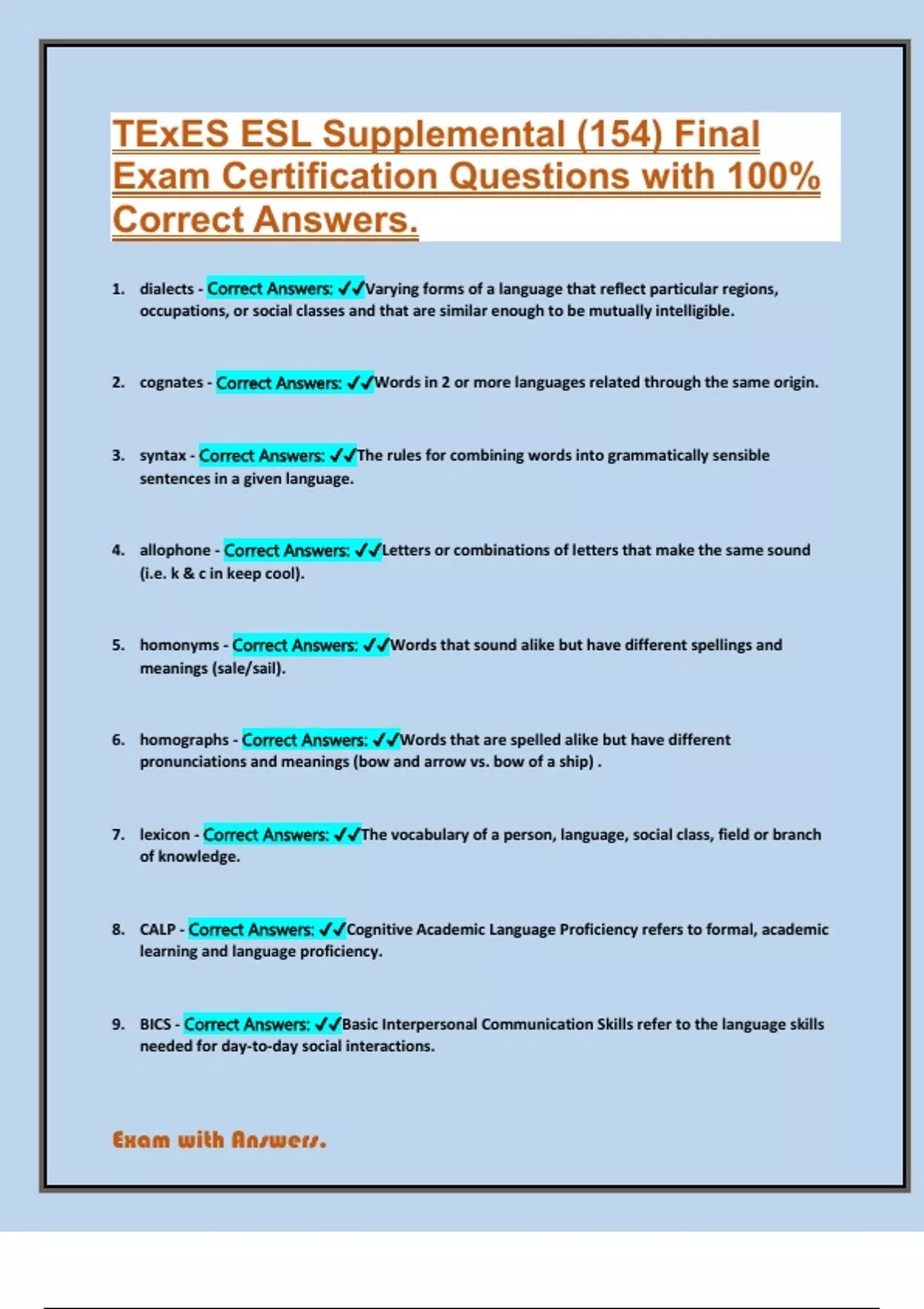 9. BICS - Correct Answers: ✔✔Basic Interpersonal Communication Skills refer to the language skills
