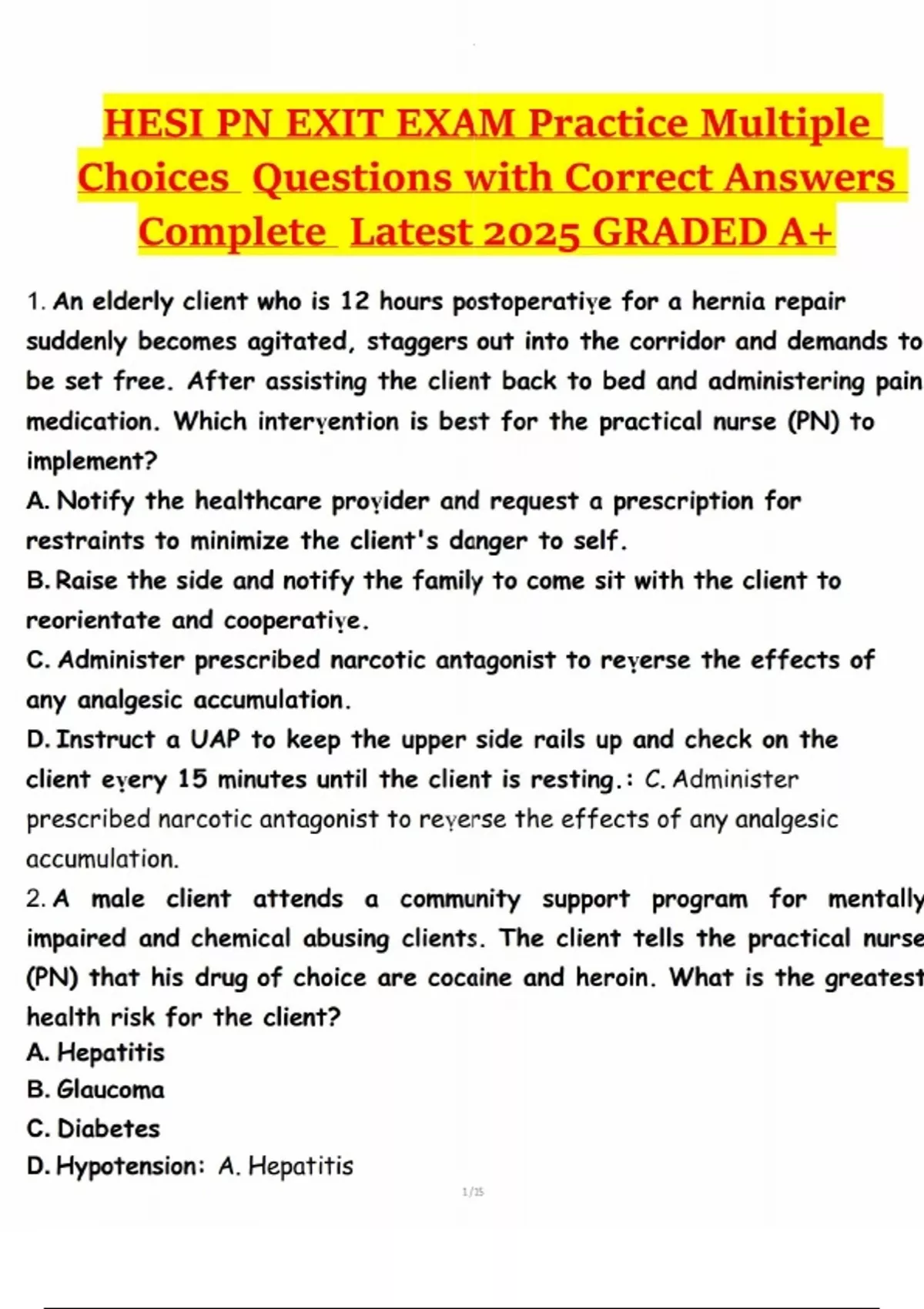 HESI PN EXIT EXAM Practice Multiple Choices Questions with Correct Answers Complete Latest 2025 GRADED A+