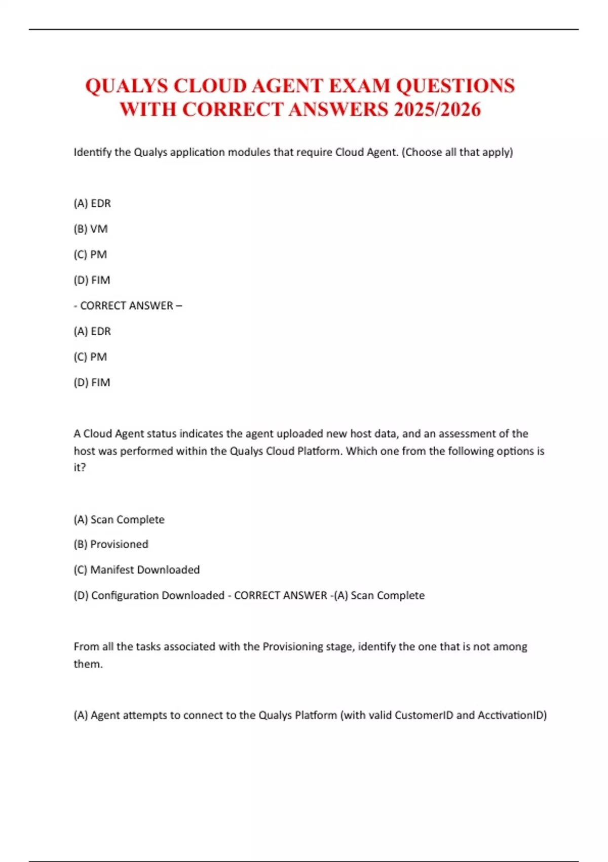 QUALYS CLOUD AGENT EXAM QUESTIONS WITH CORRECT ANSWERS 2025/2026