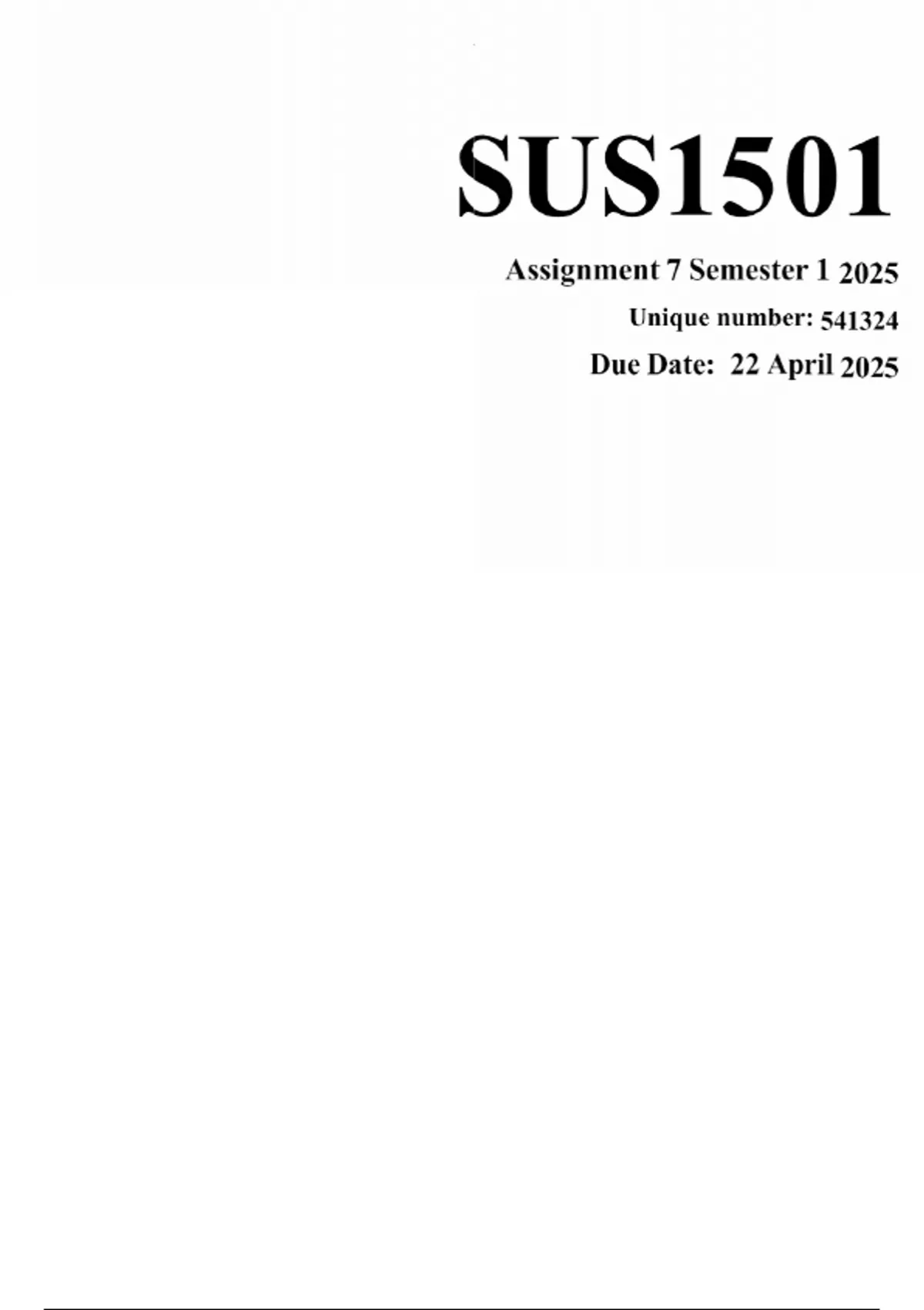 “Full and updated answers for SUS1501 Assignment 7 (Due April 22, 2025) – Semester 1. Correct formatting, well explained.” “Complete and up-to-date answers for SUS1501 Assignment 7 – Semester 1 2025. Covers all questions due by 22 April 2025. Great for UNISA students. Based on latest curriculum.” This document provides the full set of answers for Assignment 7 of the SUS1501 module, titled "Sustainability and Greed," at the University of South Africa (UNISA) for Semester 1 of the 2025 academic year. The answers align with the official assignment instructions due on 22 April 2025. All responses are complete and structured according to the latest guidelines for this course.