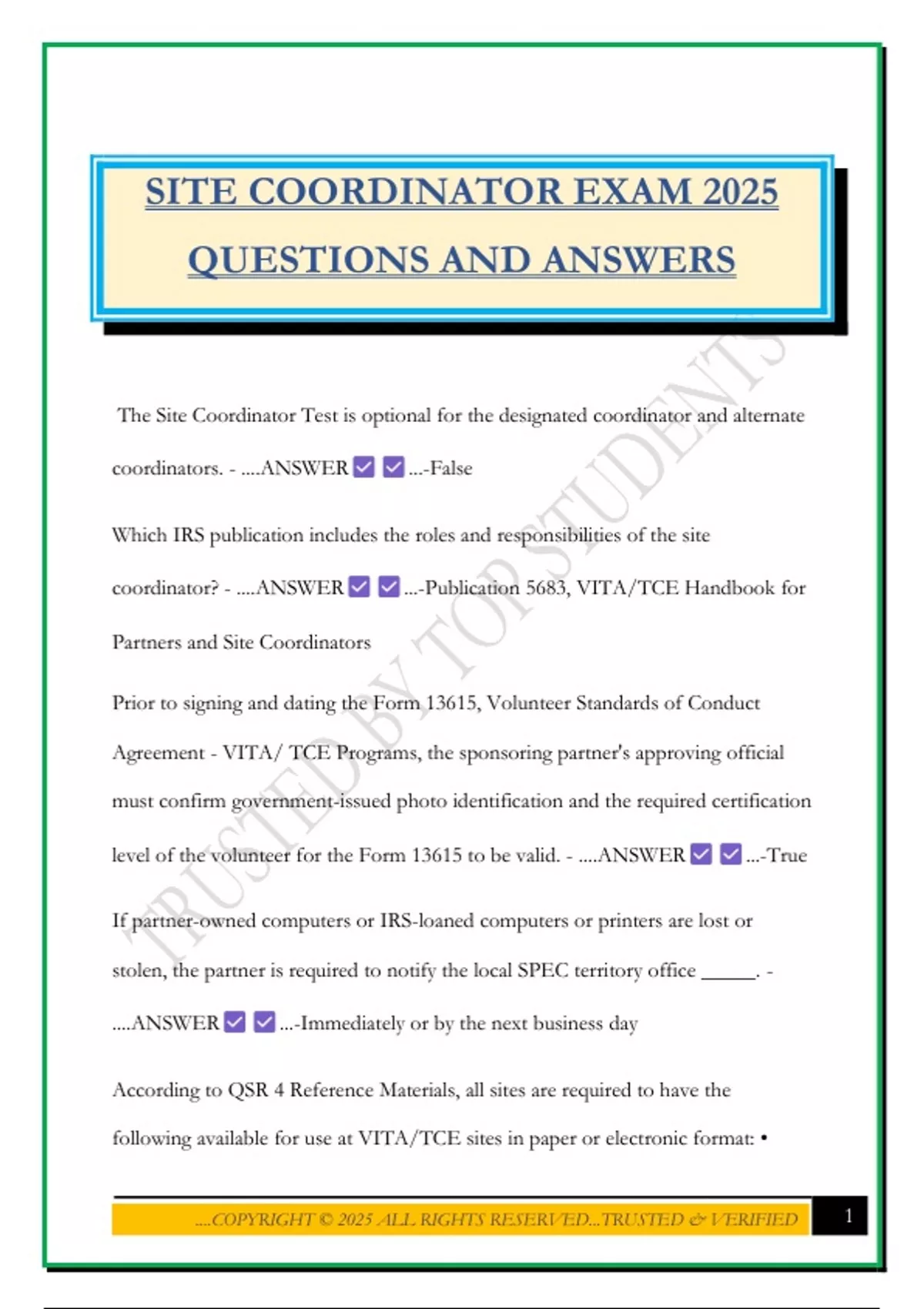 SITE COORDINATOR EXAM 2025 QUESTIONS AND ANSWERS