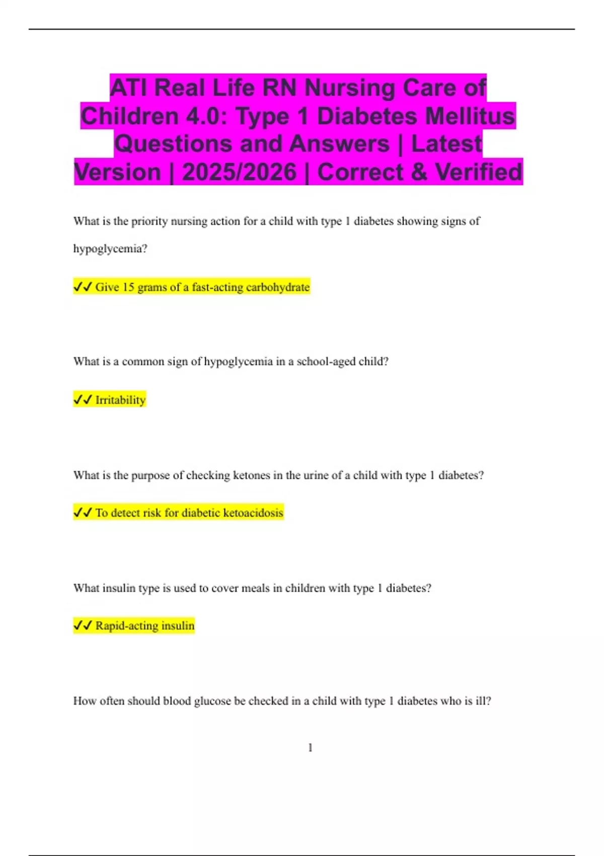ATI Real Life RN Nursing Care of Children 4.0: Type 1 Diabetes Mellitus Questions and Answers | Latest Version | 2025/2026 | Correct & Verified