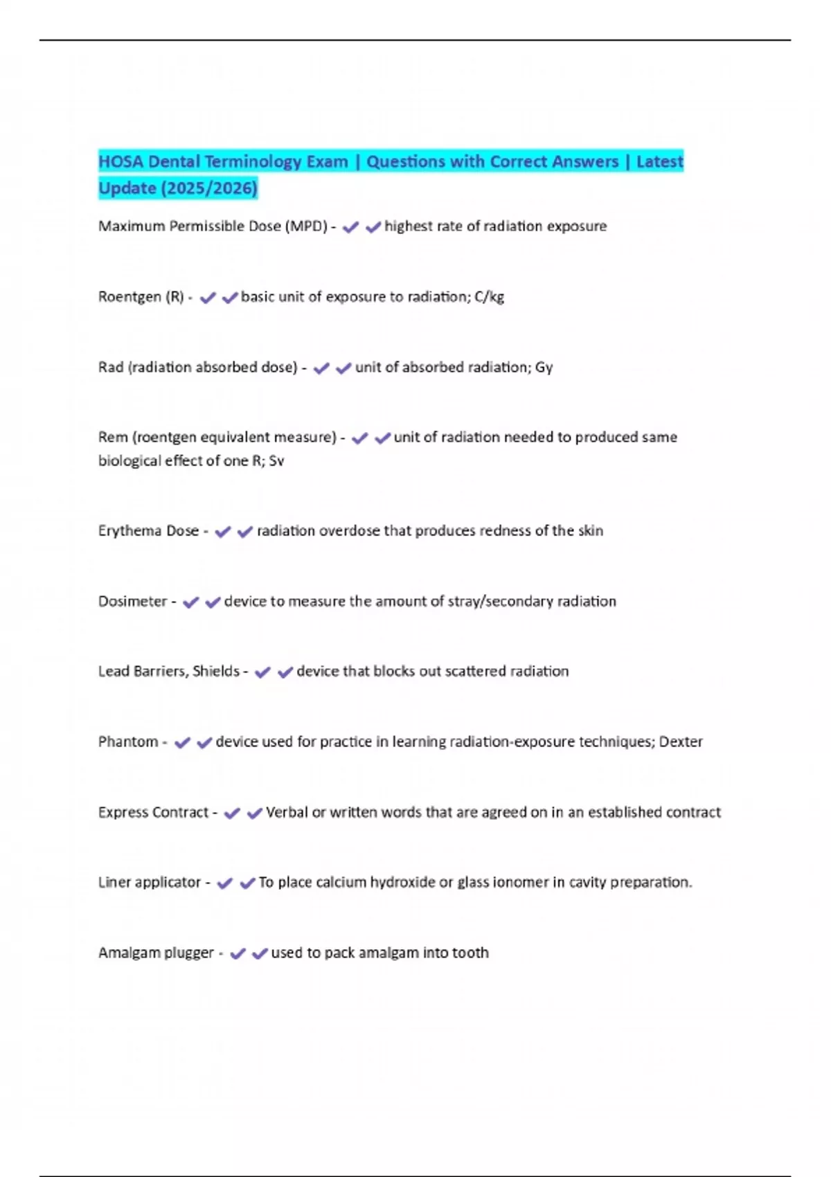 HOSA Dental Terminology Exam | Questions with Correct Answers | Latest Update (2025/2026)
