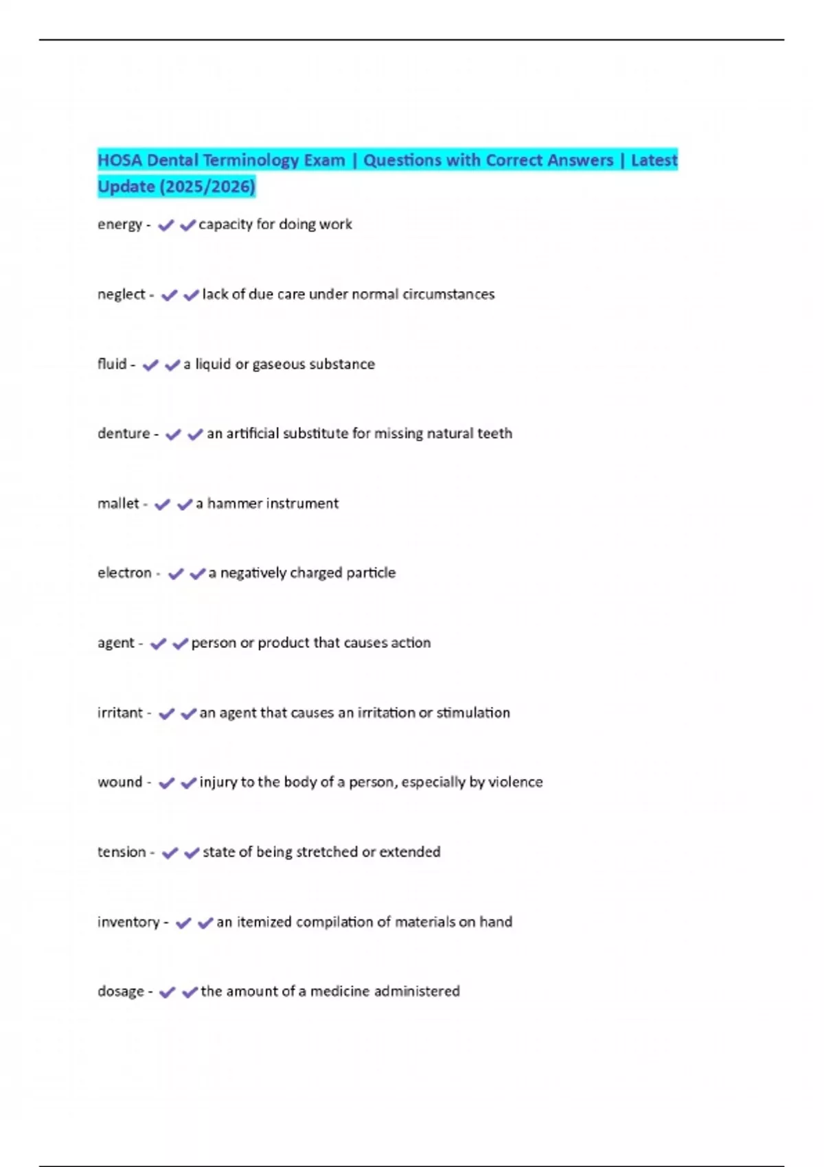 HOSA Dental Terminology Exam | Questions with Correct Answers | Latest Update (2025/2026)