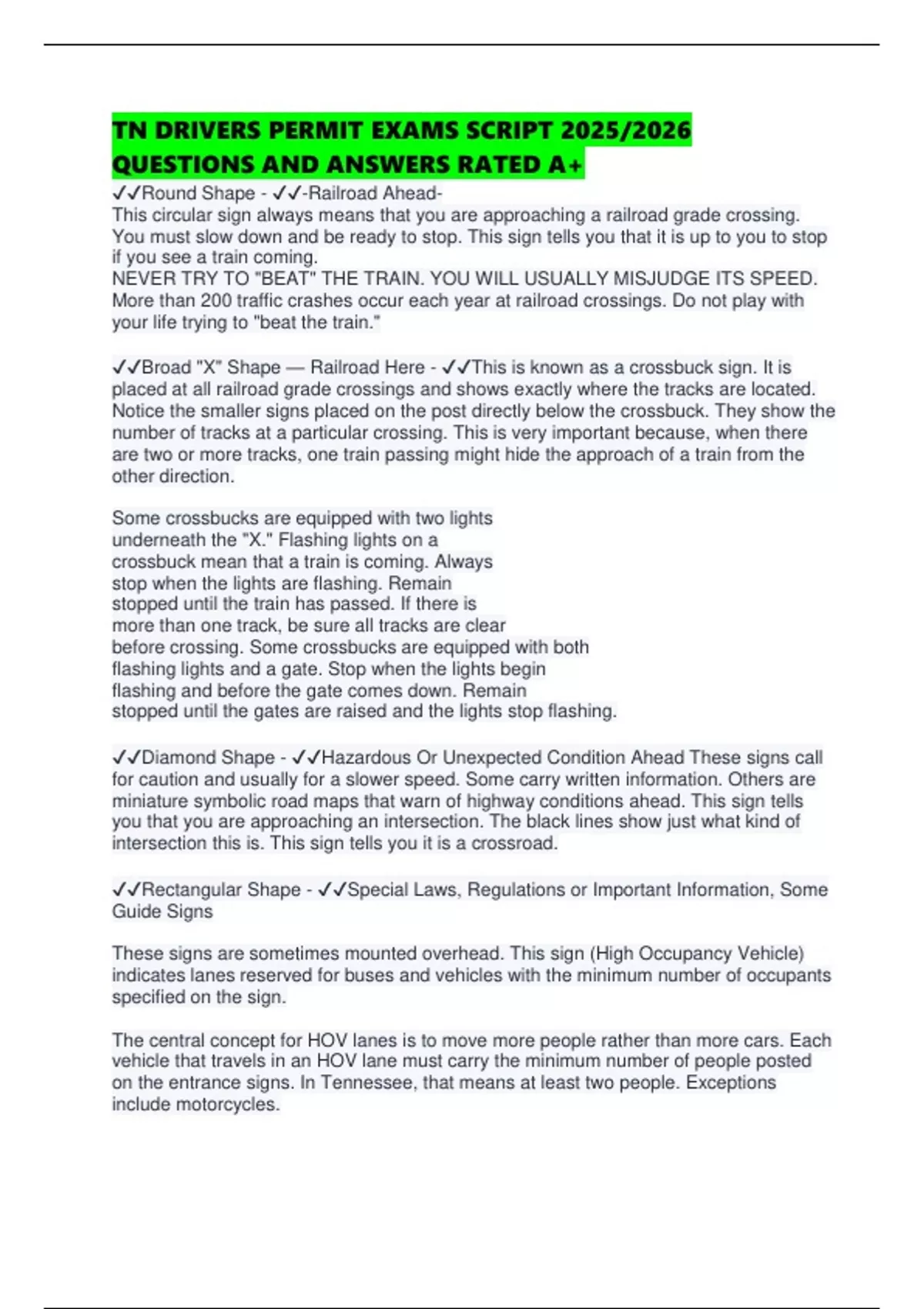 TN DRIVERS PERMIT EXAMS SCRIPT 2025/2026