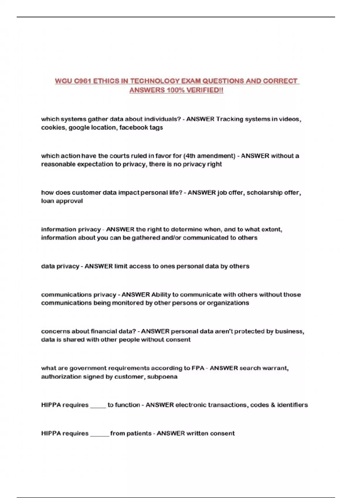 WGU C961 ETHICS IN TECHNOLOGY EXAM QUESTIONS AND CORRECT ANSWERS 100% VERIFIED!!...