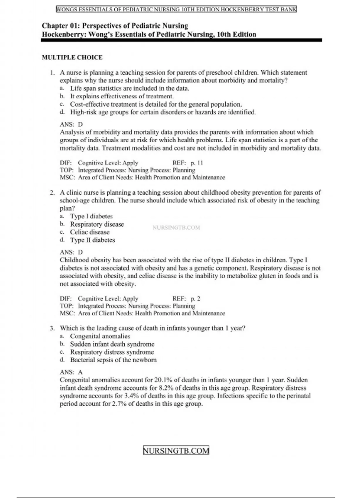 Test Bank For Wong's Essentials of Pediatric Nursing 10th Edition By Marilyn J. Hockenberry & David Wilson & Cheryl C Rodgers ( ) / 9780323353168 / Chapter 1-30 / Complete Questions and Answers A+