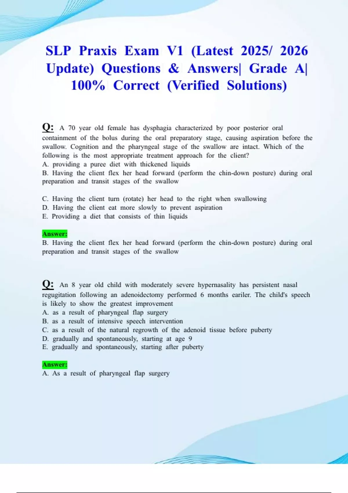 SLP Praxis Exam V1 (Latest 2025/ 2026 Update) Questions & Answers| Grade A| 100% Correct (Verified Solutions)