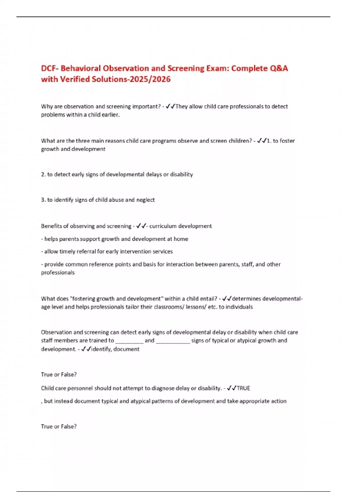DCF- Behavioral Observation and Screening Exam: Complete Q&A with Verified Solutions-2025/2026