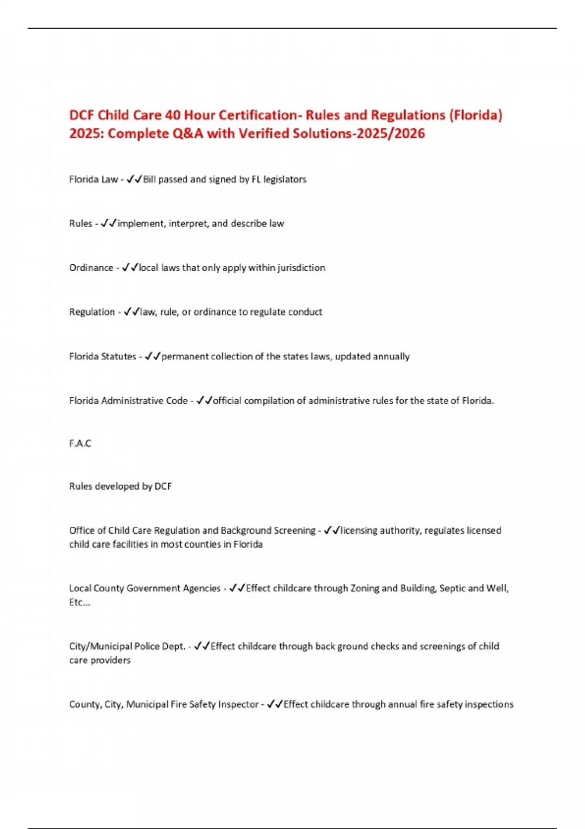 DCF Child Care 40 Hour Certification- Rules and Regulations (Florida) 2025: Complete Q&A with Verified Solutions-2025/2026