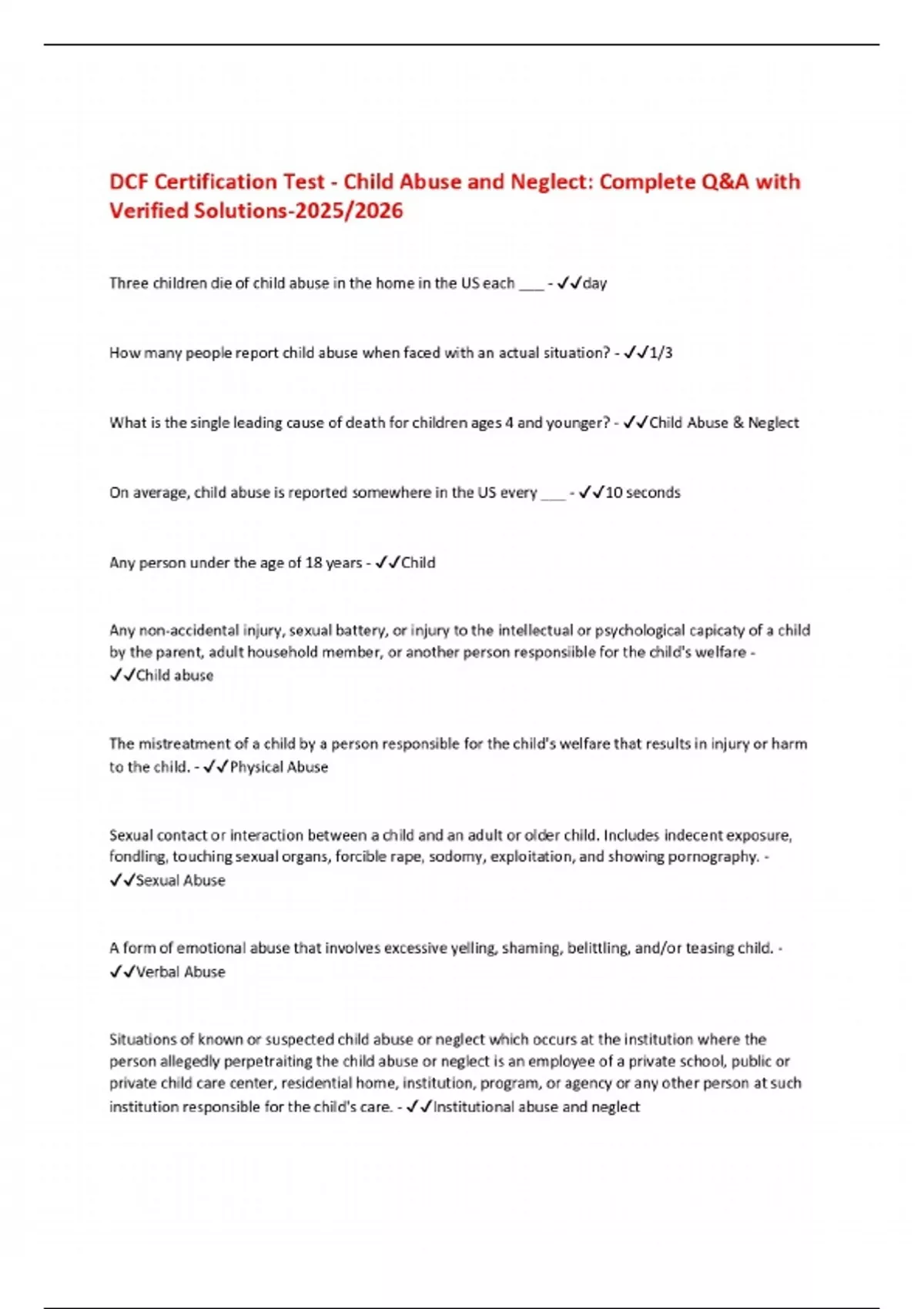 DCF Certification Test - Child Abuse and Neglect: Complete Q&A with Verified Solutions-2025/2026