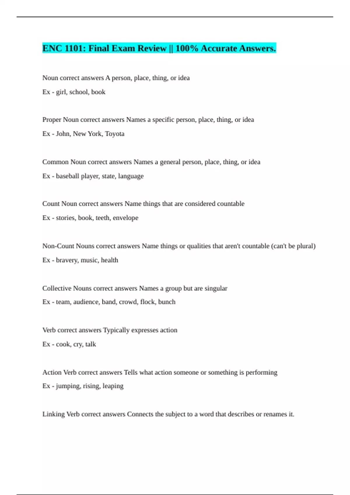 Noun correct answers A person, place, thing, or idea Ex - girl, school, book Proper Noun correct answers Names a specific person, place, thing, or idea Ex - John, New York, Toyota Common Noun correct answers Names a general person, place, thing, or idea Ex - baseball player, state, language Count Noun correct answers Name things that are considered countable Ex - stories, book, teeth, envelope Non-Count Nouns correct answers Name things or qualities that aren't countable (can't be plural) Ex - bravery, music, health Collective Nouns correct answers Names a group but are singular Ex - team, audience, band, crowd, flock, bunch Verb correct answers Typically expresses action Ex - cook, cry, talk Action Verb correct answers Tells what action someone or something is performing Ex - jumping, rising, leaping Linking Verb correct answers Connects the subject to a word that describes or renames it.