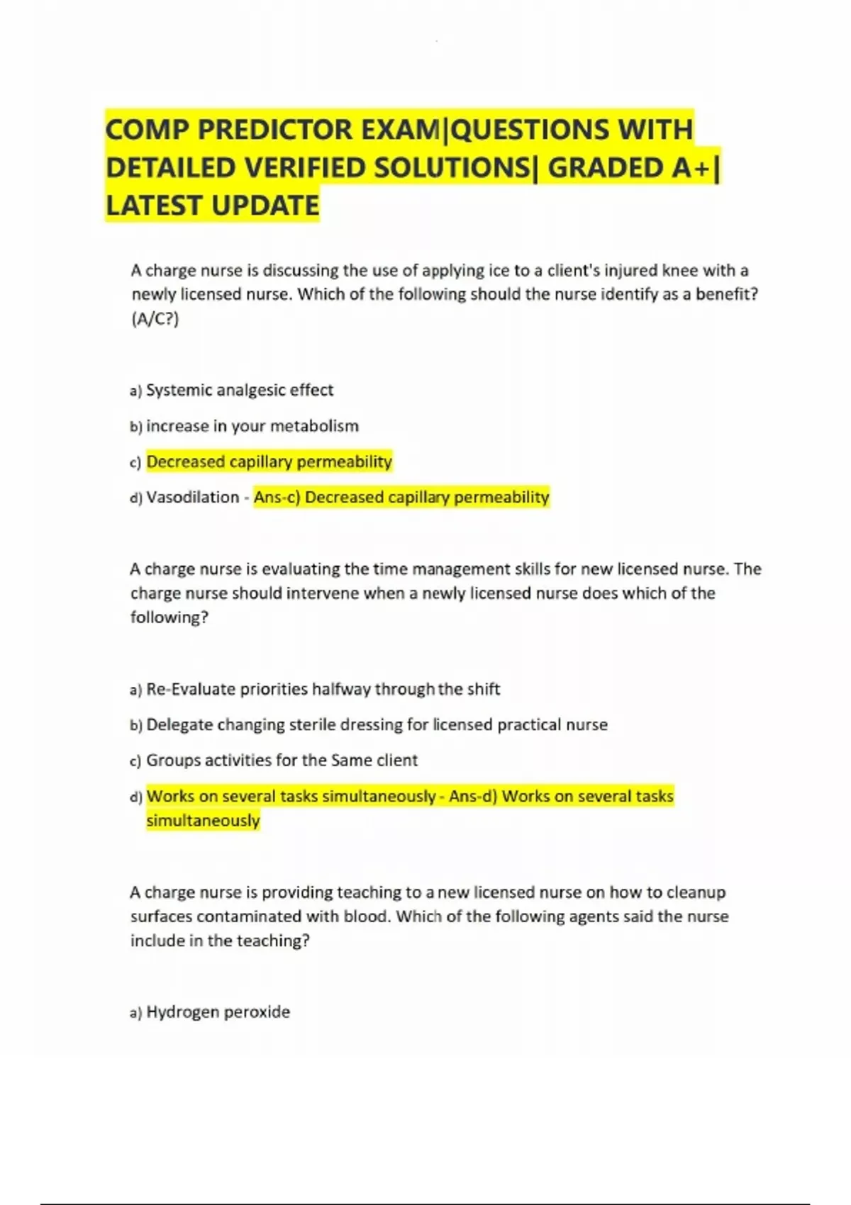 COMP PREDICTOR EXAM|QUESTIONS WITH DETAILED VERIFIED SOLUTIONS| GRADED A+| LATEST UPDATE A charge nurse is discussing the use of applying ice to a client's injured knee with a newly licensed nurse. Which of the following should the nurse identify as a benefit? (A/C?) a) Systemic analgesic effect b) increase in your metabolism c) Decreased capillary permeability d) Vasodilation - Ans-c) Decreased capillary permeability A charge nurse is evaluating the time management skills for new licensed nurse. The charge nurse should intervene when a newly licensed nurse does which of the following? a) Re-Evaluate priorities halfway through the shift b) Delegate changing sterile dressing for licensed practical nurse c) Groups activities for the Same client d) Works on several tasks simultaneously - Ans-d) Works on several tasks simultaneously A charge nurse is providing teaching to a new licensed nurse on how to cleanup surfaces contaminated with blood. Which of the following agents said the nurse include in the teaching? a) Hydrogen peroxide