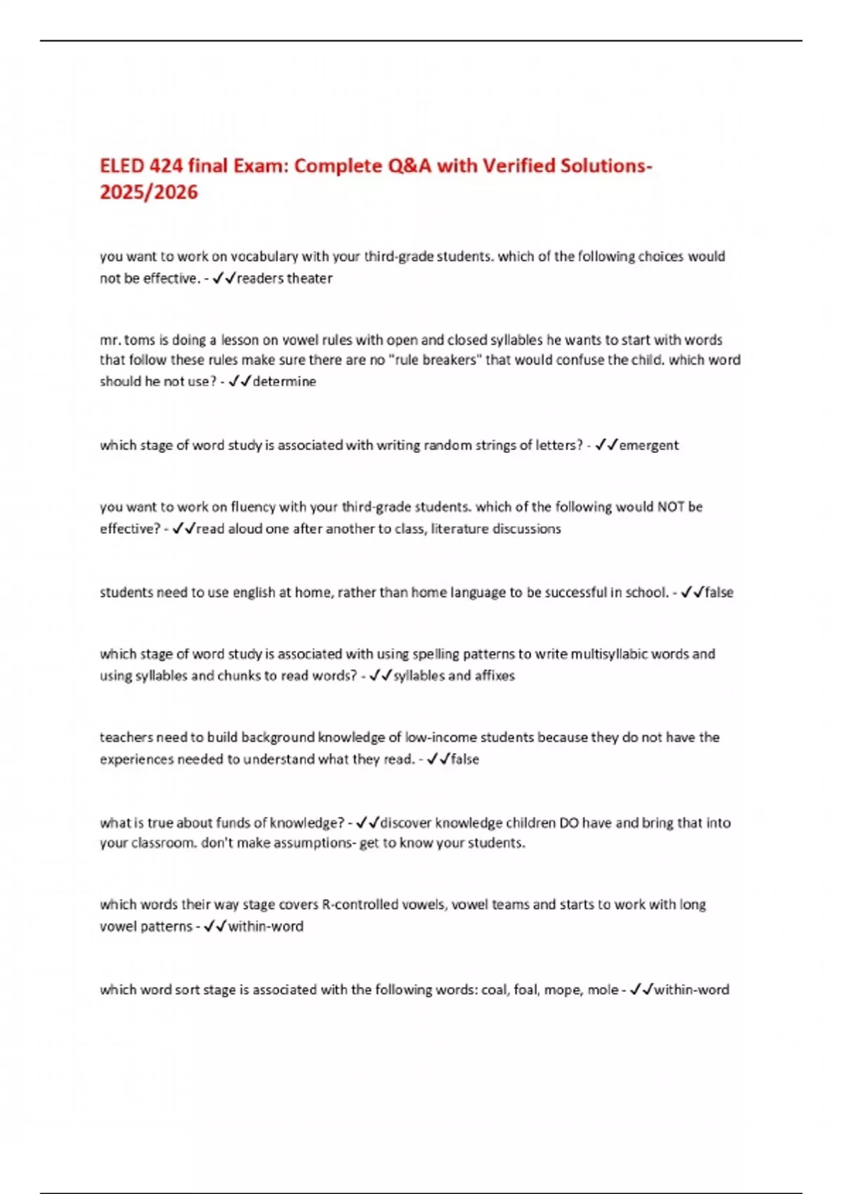 ELED 424 final Exam: Complete Q&A with Verified Solutions 2025/2026