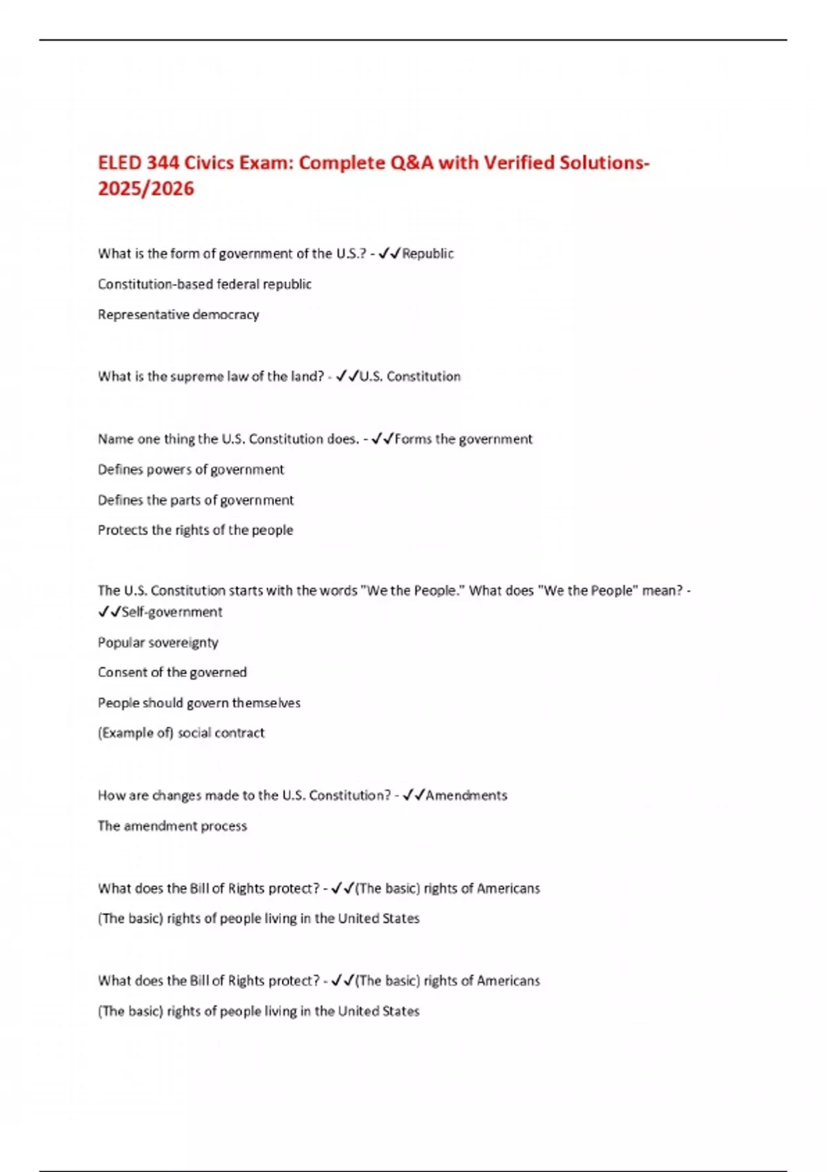 ELED 344 Civics Exam: Complete Q&A with Verified Solutions 2025/2026