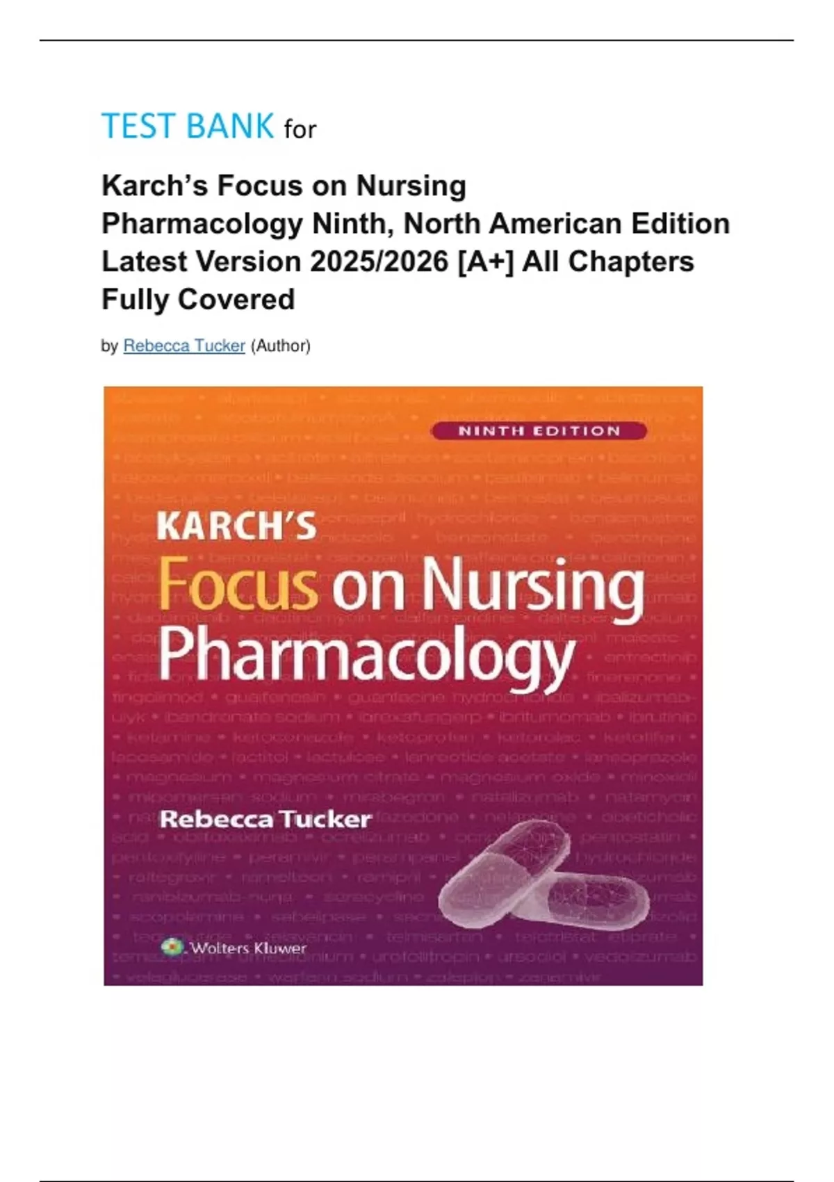 TEST BANK for Karch’s Focus on Nursing Pharmacology Ninth, North American Edition Latest Version 2025/2026 [A+] All Chapters Fully Covered by Rebecca Tucker (Author)