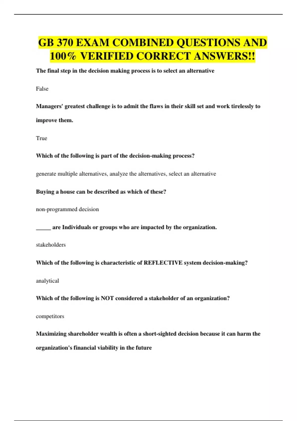 GB 370 EXAM COMBINED QUESTIONS AND 100% VERIFIED CORRECT ANSWERS!!