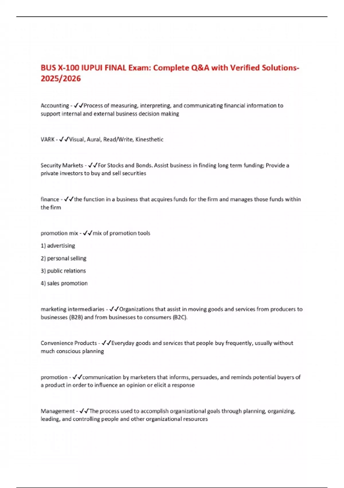 BUS X-100 IUPUI FINAL Exam: Complete Q&A with Verified Solutions 2025/2026