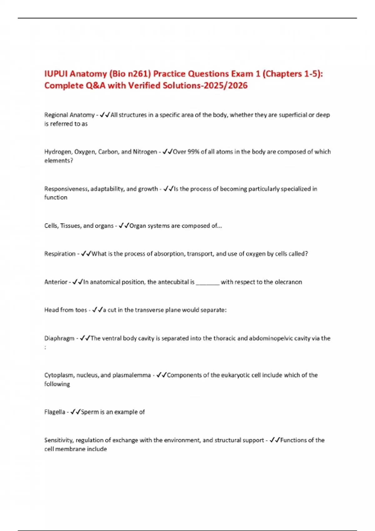 IUPUI Anatomy (Bio n261) Practice Questions Exam 1 (Chapters 1-5): Complete Q&A with Verified Solutions-2025/2026