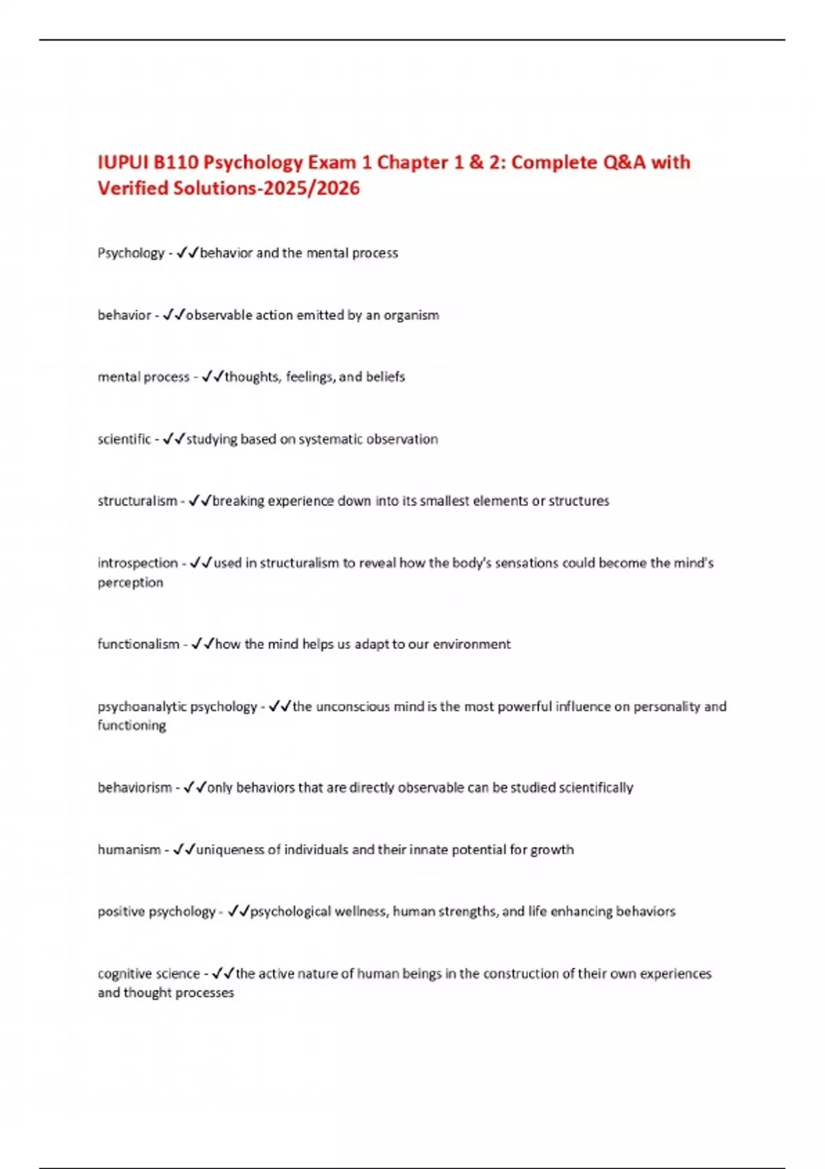 IUPUI B110 Psychology Exam 1 Chapter 1 & 2: Complete Q&A with Verified Solutions-2025/2026