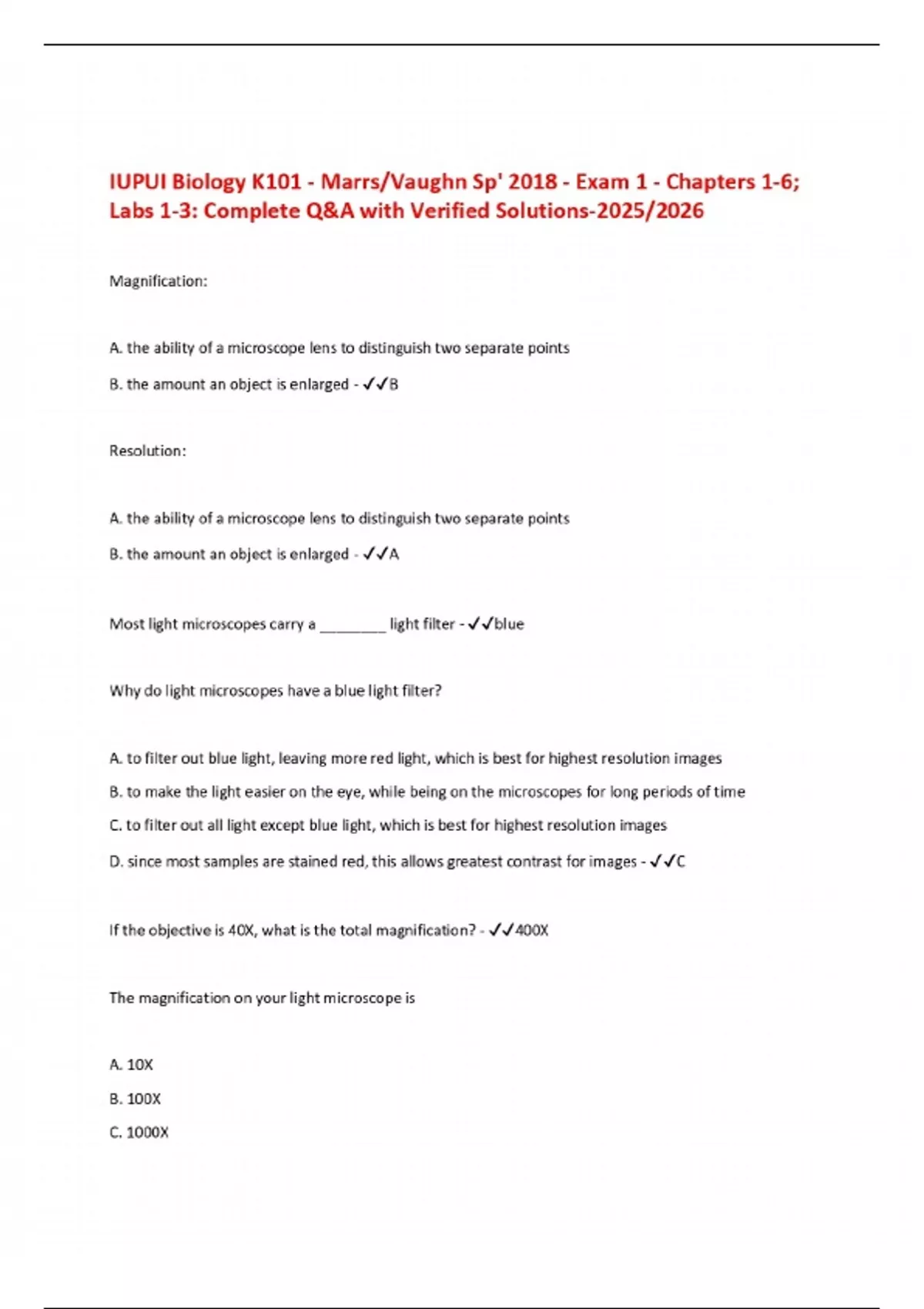 IUPUI Biology K101 - Marrs/Vaughn Sp' 2018 - Exam 1 - Chapters 1-6; Labs 1-3: Complete Q&A with Verified Solutions-2025/2026