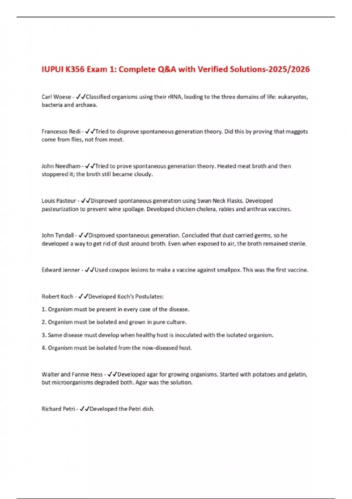 Carl Woese - Classified organisms using their rRNA, leading to the three domains of life: eukaryotes, bacteria and archaea. Francesco Redi - Tried to disprove spontaneous generation theory. Did this by proving that maggots come from flies, not from meat. John Needham - Tried to prove spontaneous generation theory. Heated meat broth and then stoppered it; the broth still became cloudy. Louis Pasteur - Disproved spontaneous generation using Swan Neck Flasks. Developed pasteurization to prevent wine spoilage. Developed chicken cholera, rabies and anthrax vaccines. John Tyndall - Disproved spontaneous generation. Concluded that dust carried germs, so he developed a way to get rid of dust around broth. Even when exposed to air, the broth remained sterile.