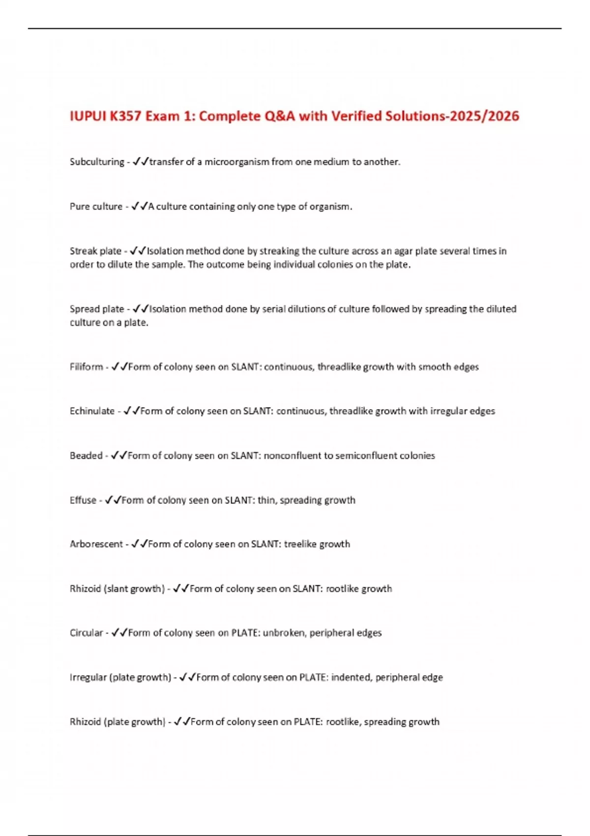 Subculturing - transfer of a microorganism from one medium to another. Pure culture - A culture containing only one type of organism. Streak plate - Isolation method done by streaking the culture across an agar plate several times in order to dilute the sample. The outcome being individual colonies on the plate. Spread plate - Isolation method done by serial dilutions of culture followed by spreading the diluted culture on a plate. Filiform - Form of colony seen on SLANT: continuous, threadlike growth with smooth edges Echinulate - Form of colony seen on SLANT: continuous, threadlike growth with irregular edges Beaded - Form of colony seen on SLANT: nonconfluent to semiconfluent colonies Effuse - Form of colony seen on SLANT: thin, spreading growth