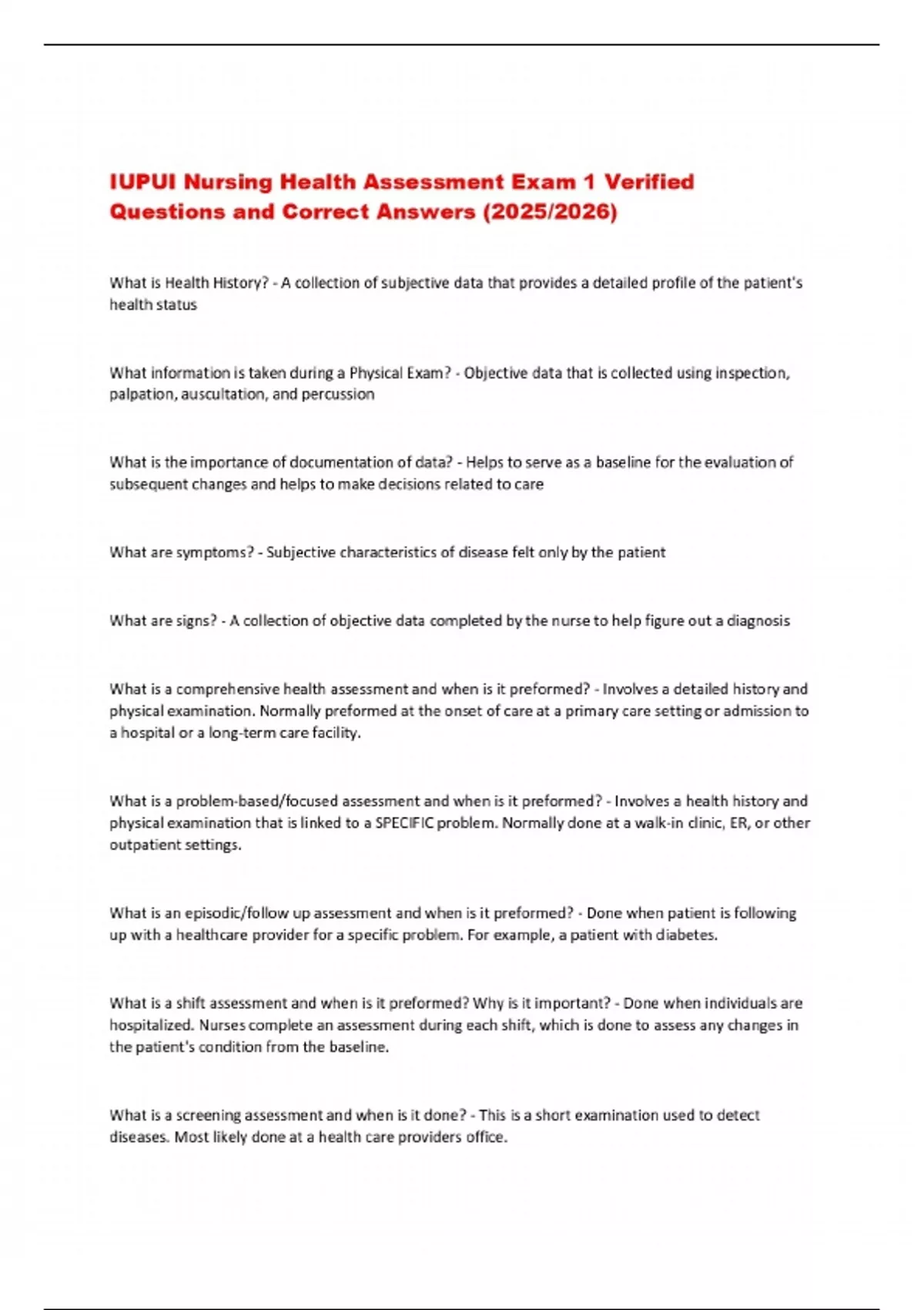 IUPUI Nursing Health Assessment Exam 1 Verified Questions and Correct Answers (2025/2026)
