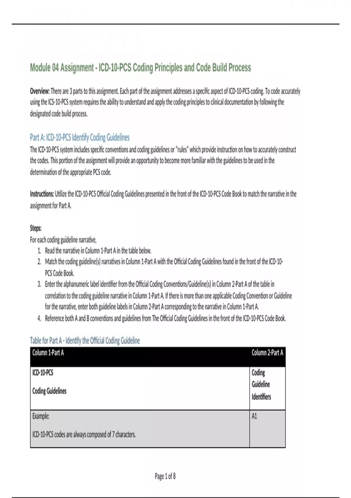 Overview: There are 3 parts to this assignment. Each part of the assignment addresses a specific aspect of ICD-10-PCS coding. To code accurately
