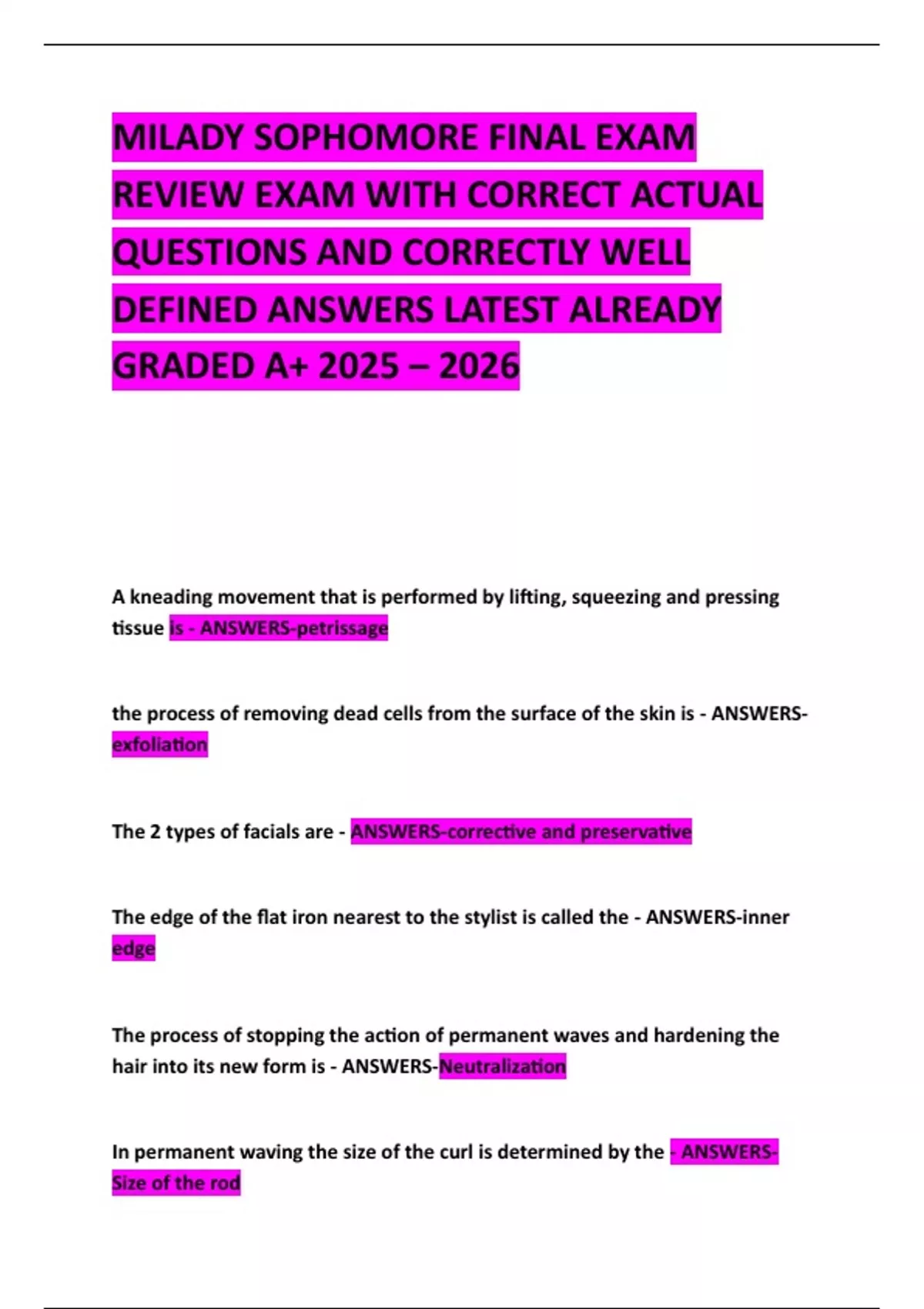 MILADY SOPHOMORE FINAL EXAM REVIEW EXAM WITH CORRECT ACTUAL QUESTIONS AND CORRECTLY WELL DEFINED ANSWERS LATEST ALREADY GRADED A+ 2025 – 2026