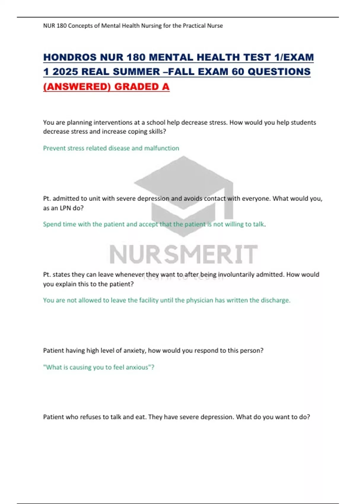 HONDROS NUR 180 MENTAL HEALTH TEST 1/EXAM