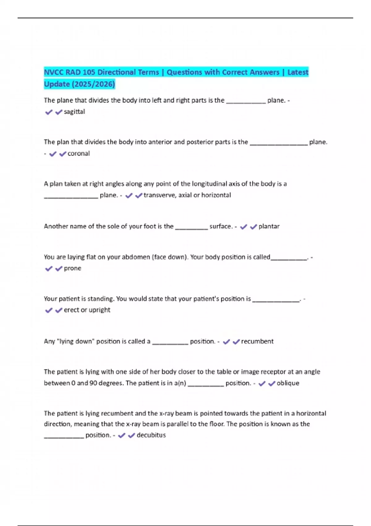 NVCC RAD 105 Directional Terms | Questions with Correct Answers | Latest Update (2025/2026)