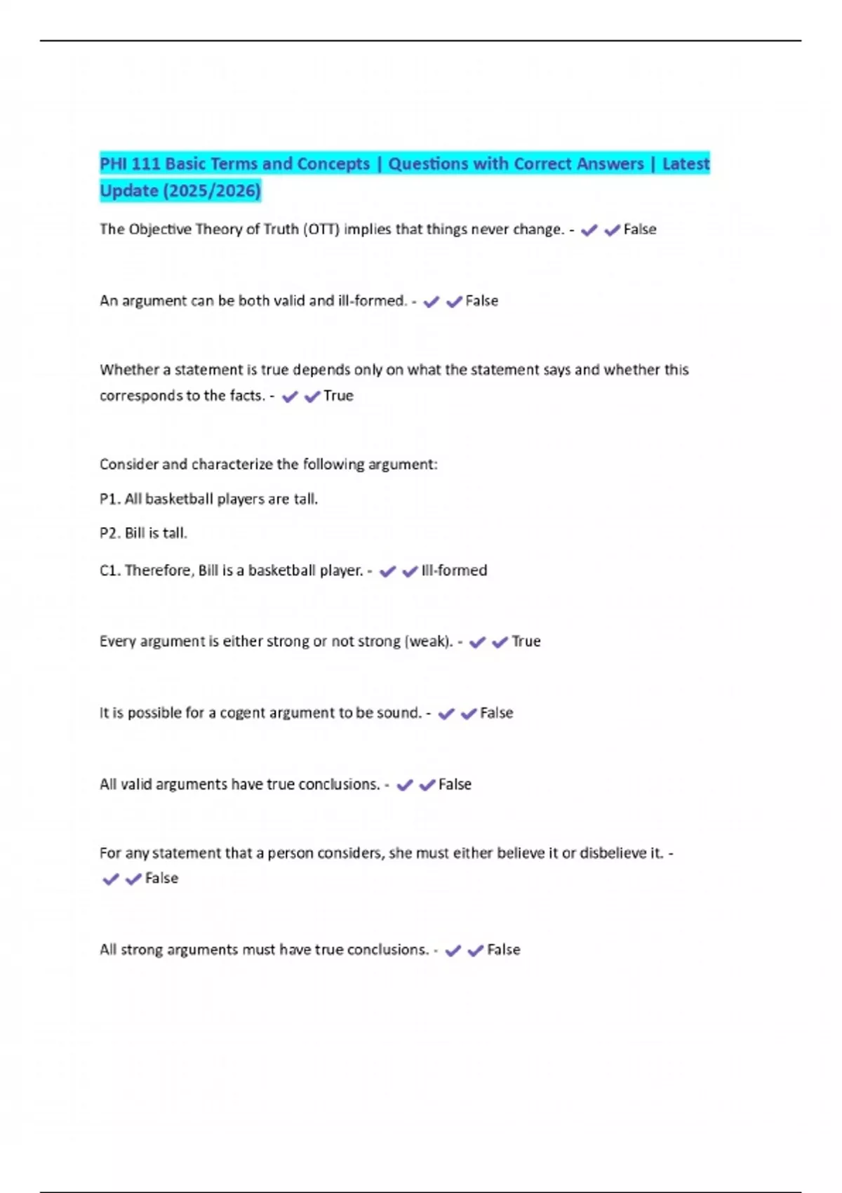 PHI 111 Basic Terms and Concepts | Questions with Correct Answers | Latest Update (2025/2026)