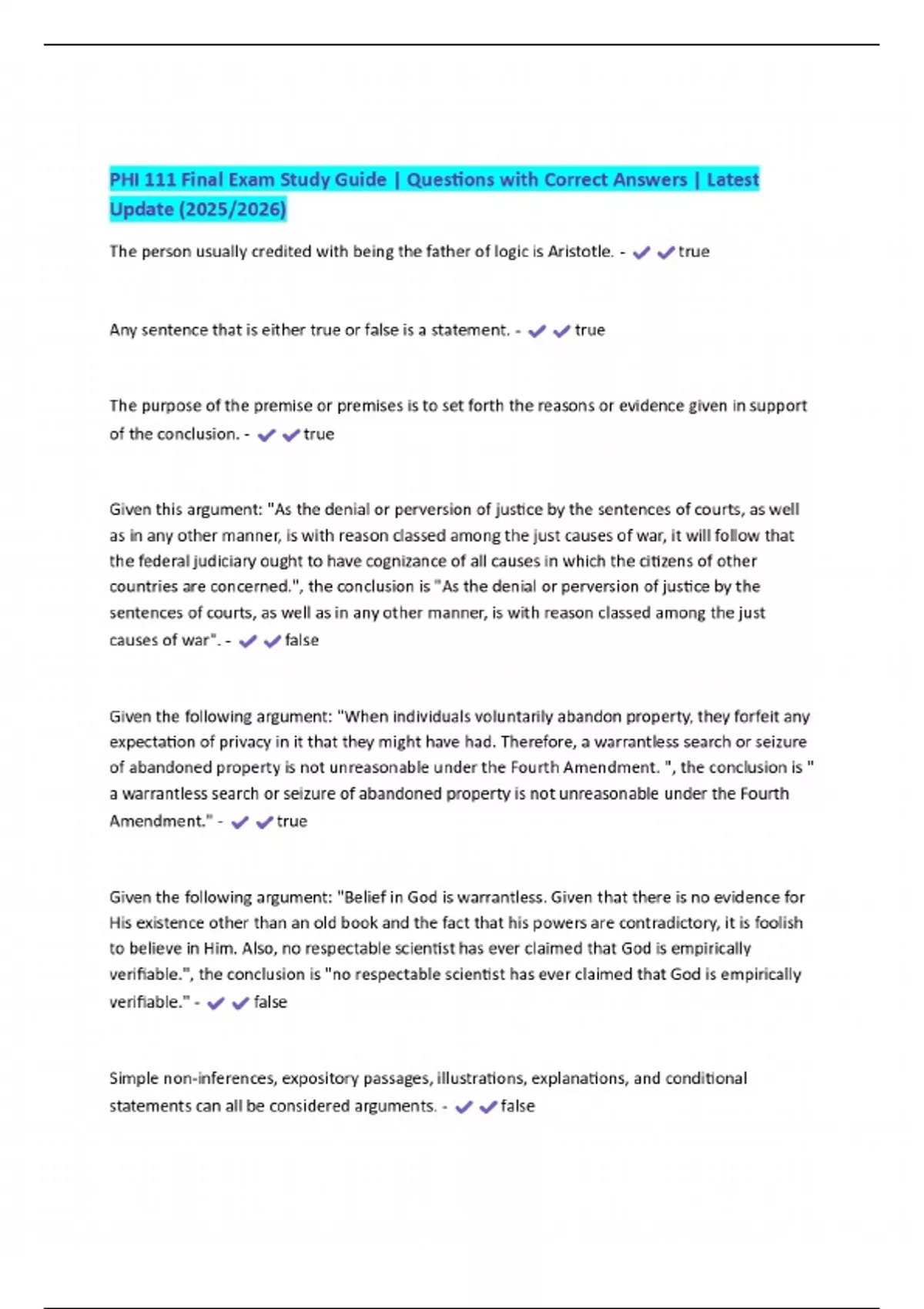PHI 111 Final Exam Study Guide | Questions with Correct Answers | Latest Update (2025/2026)