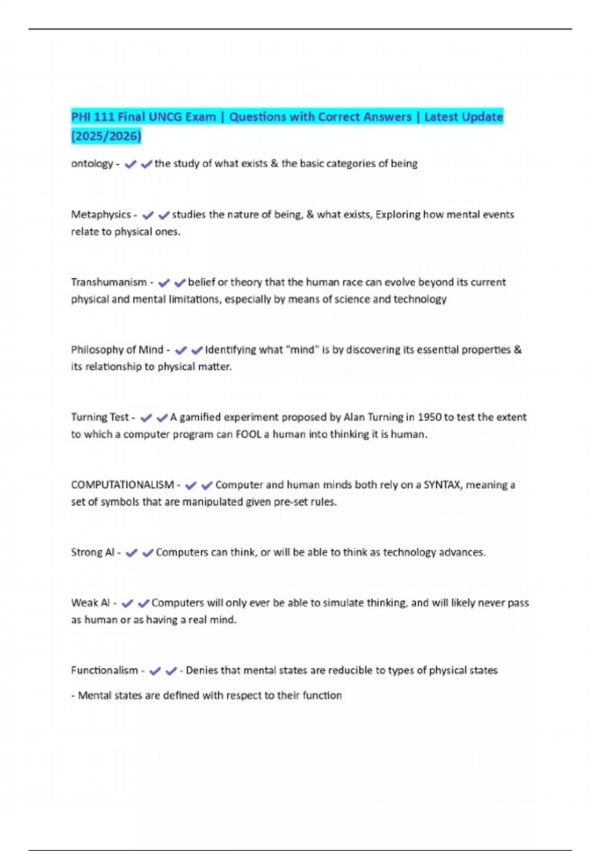 PHI 111 Final UNCG Exam | Questions with Correct Answers | Latest Update (2025/2026)