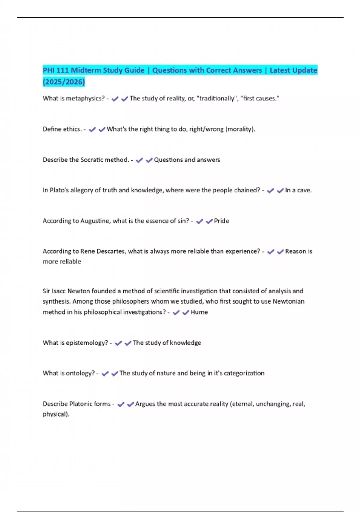 PHI 111 Midterm Study Guide | Questions with Correct Answers | Latest Update (2025/2026)