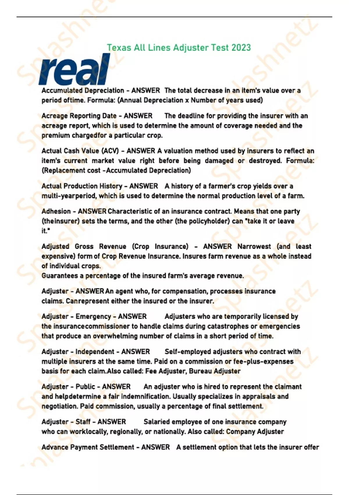 Actual Cash Value (ACV) - ANSWER A valuation method used by insurers to reflect an