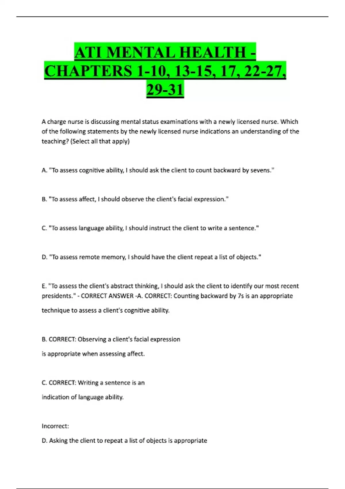 ATI MENTAL HEALTH - CHAPTERS 1-10, 13-15, 17, 22-27, 29-31 A charge nurse is discussing mental status examinations with a newly licensed nurse. Which of the following statements by the newly licensed nurse indications an understanding of the teaching? (Select all that apply) A. "To assess cognitive ability, I should ask the client to count backward by sevens." B. "To assess affect, I should observe the client's facial expression." C. "To assess language ability, I should instruct the client to write a sentence." D. "To assess remote memory, I should have the client repeat a list of objects." E. "To assess the client's abstract thinking, I should ask the client to identify our most recent presidents." - CORRECT ANSWER -A. CORRECT: Counting backward by 7s is an appropriate technique to assess a client's cognitive ability. B. CORRECT: Observing a client's facial expression is appropriate when assessing affect. C. CORRECT: Writing a sentence is an indication of language ability. Incorrect: D. Asking the client to repeat a list of objects is appropriate