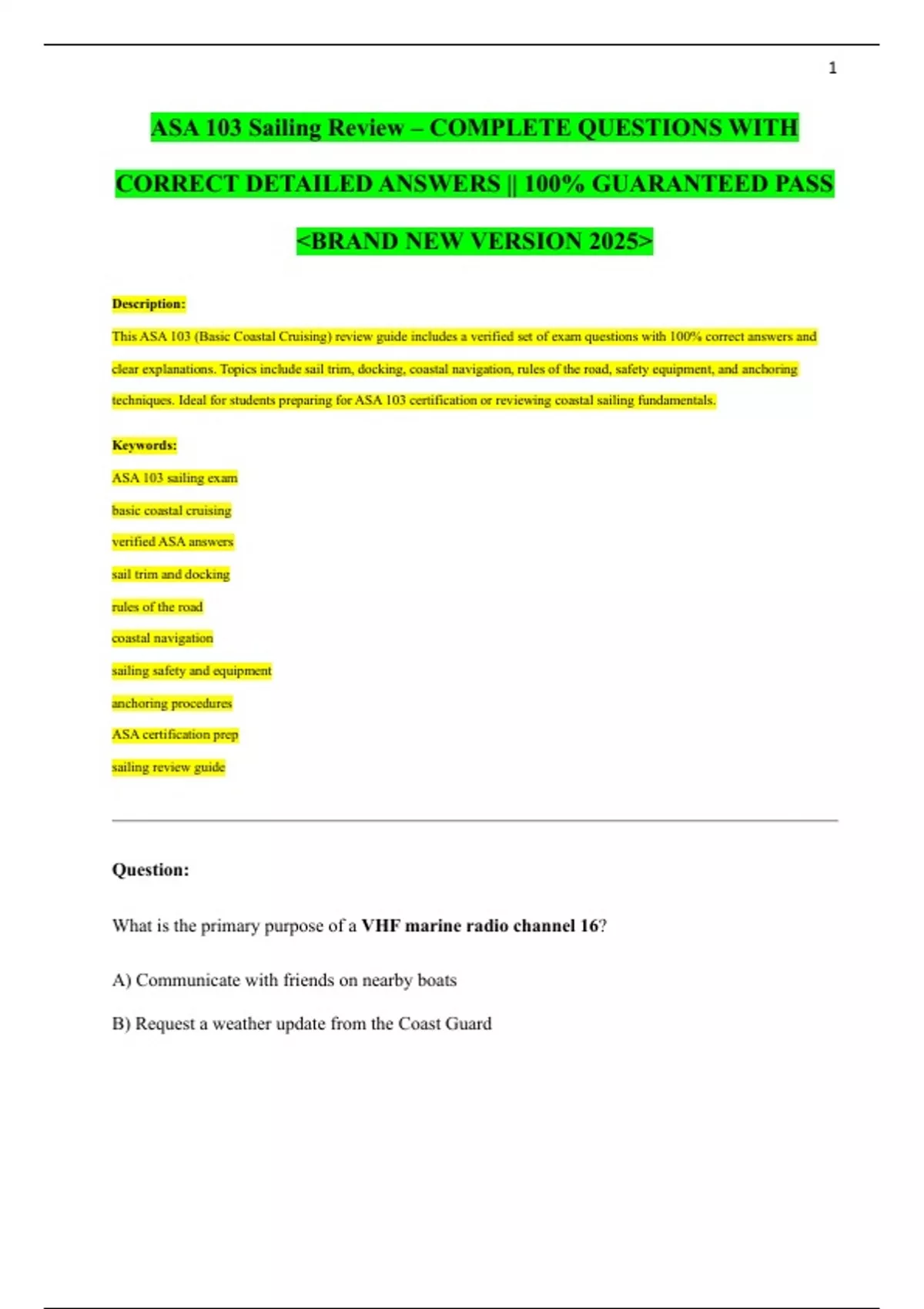 ASA 103 Sailing Review – COMPLETE QUESTIONS WITH CORRECT DETAILED ANSWERS || 100% GUARANTEED PASS &lt;BRAND NEW VERSION 2025&gt; Description: This ASA 103 (Basic Coastal Cruising) review guide includes a verified set of exam questions with 100% correct answers and clear explanations. Topics include sail trim, docking, coastal navigation, rules of the road, safety equipment, and anchoring techniques. Ideal for students preparing for ASA 103 certification or reviewing coastal sailing fundamentals. Keywords: ASA 103 sailing exam basic coastal cruising verified ASA answers sail trim and docking rules of the road coastal navigation sailing safety and equipment anchoring procedures ASA certification prep sailing review guide