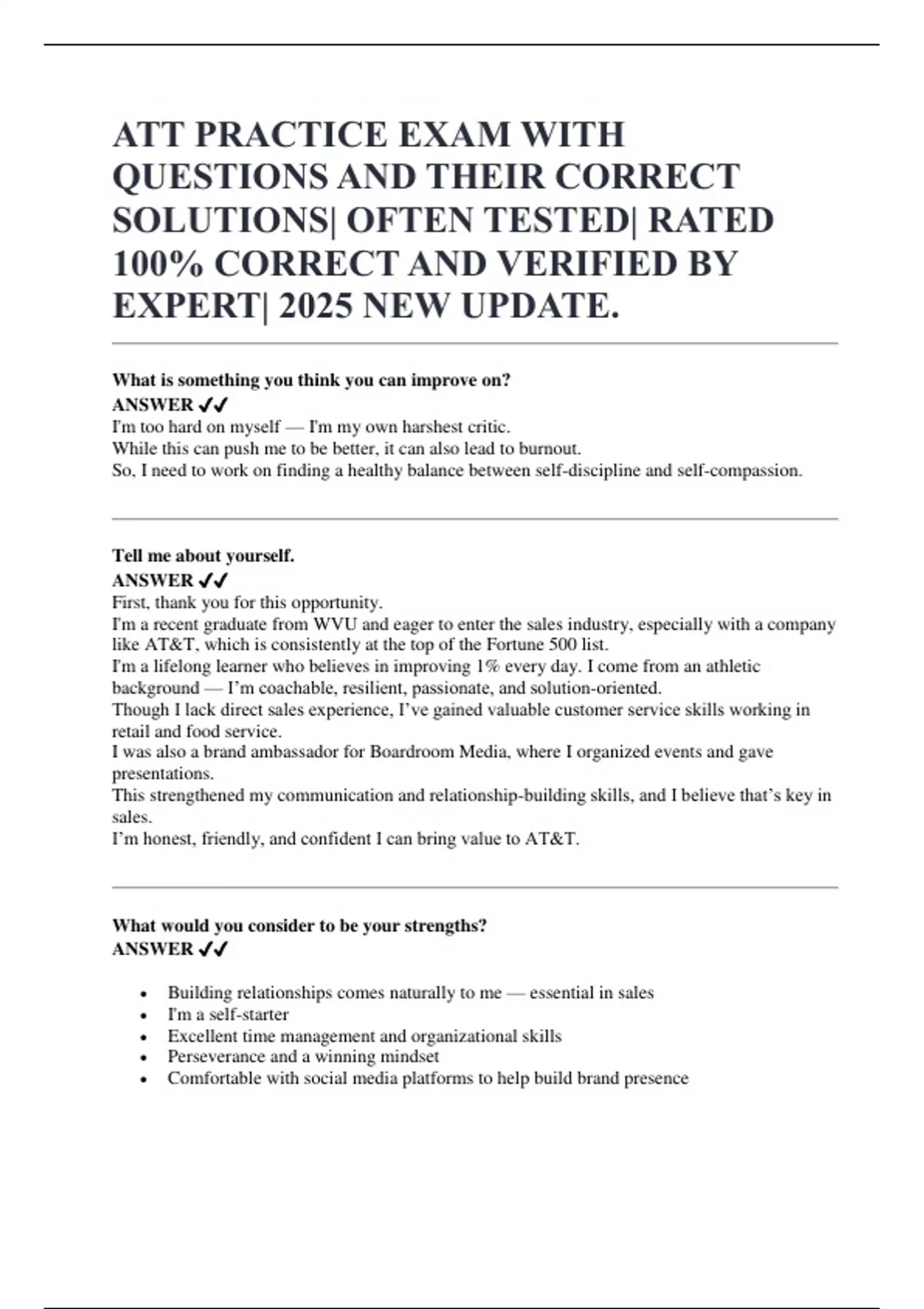 ATT PRACTICE EXAM WITH QUESTIONS AND THEIR CORRECT SOLUTIONS| OFTEN TESTED| RATED 100% CORRECT AND VERIFIED BY EXPERT| 2025 NEW UPDATE.