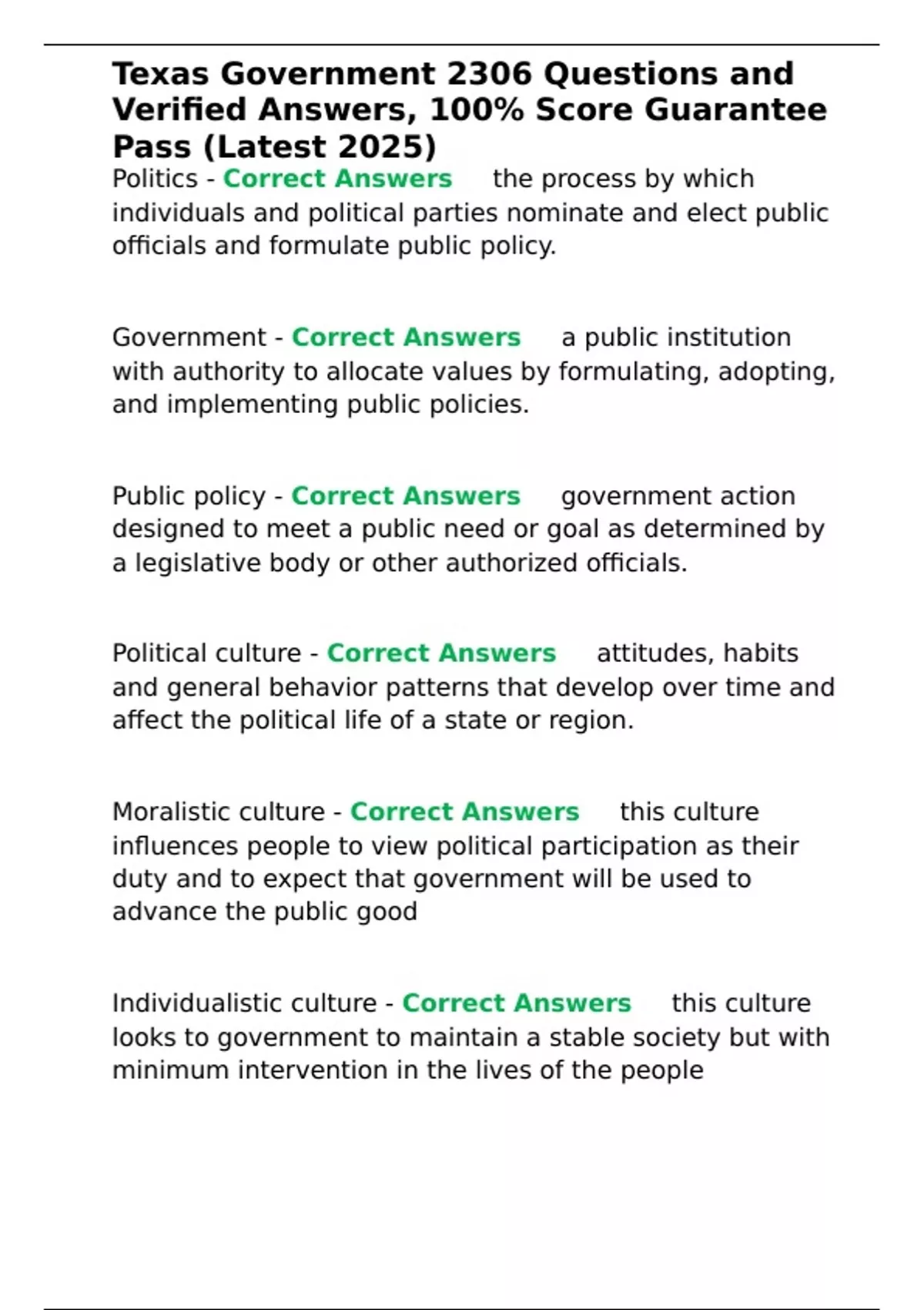 Political culture - Correct Answers ✅attitudes, habits