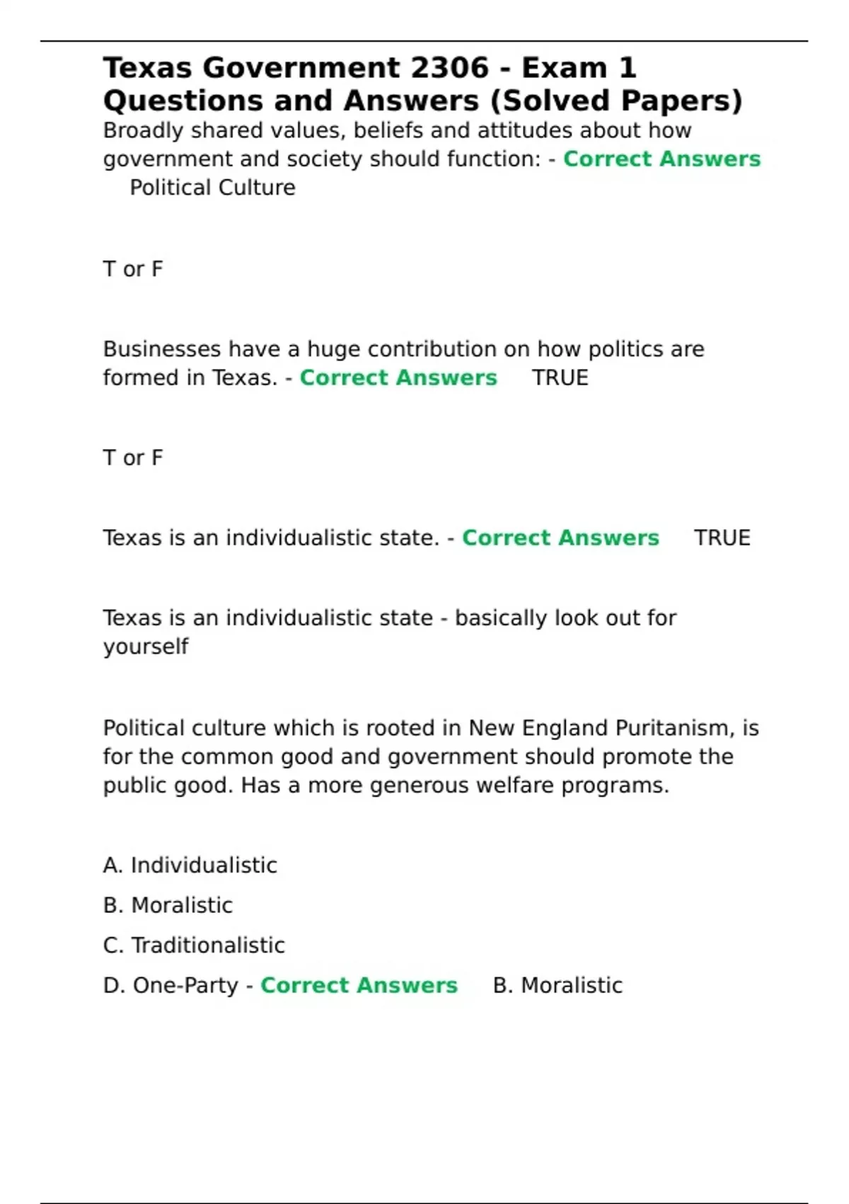Texas is an individualistic state. - Correct Answers ✅TRUE
