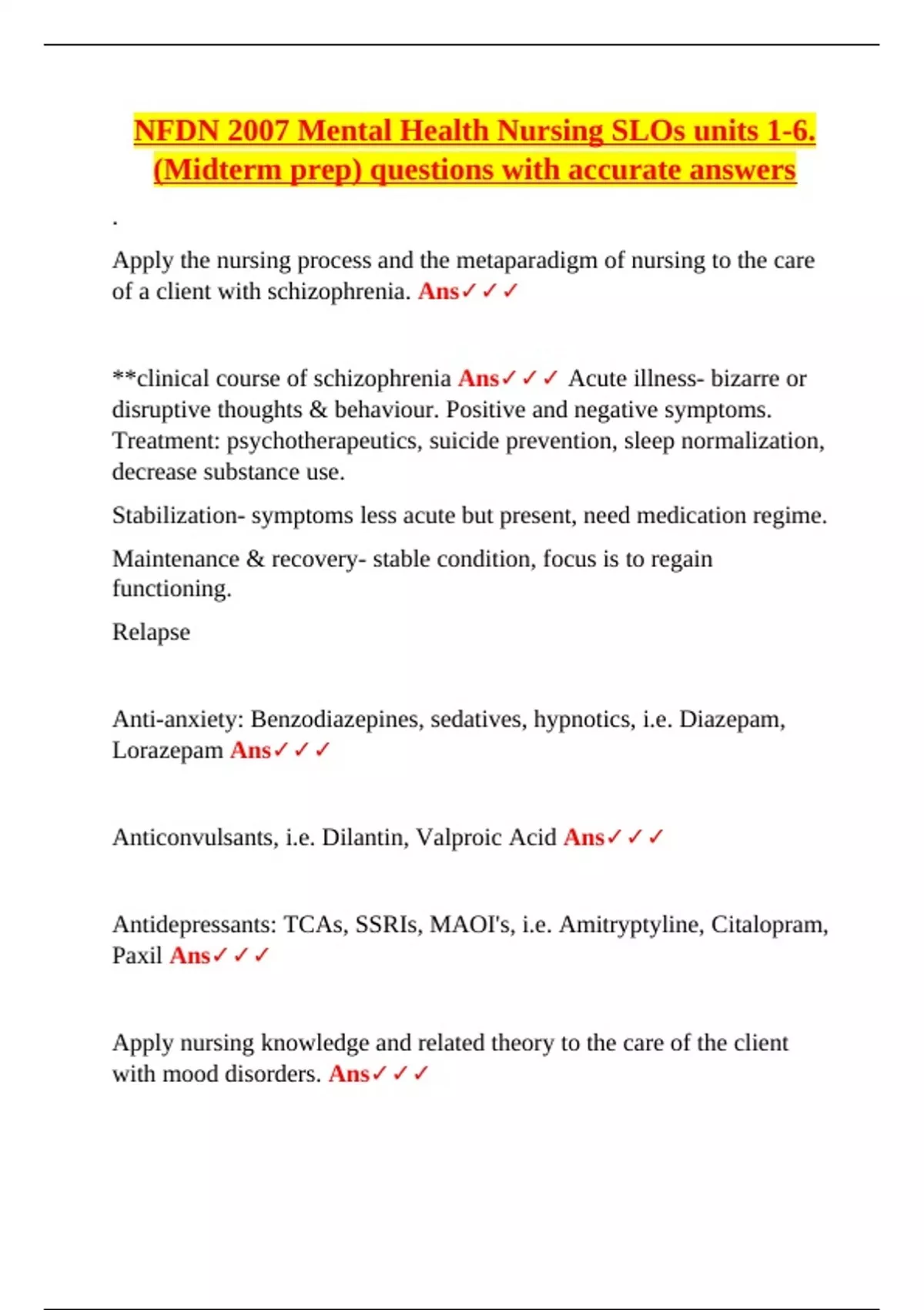 NFDN 2007 Mental Health Nursing SLOs units 1-6.