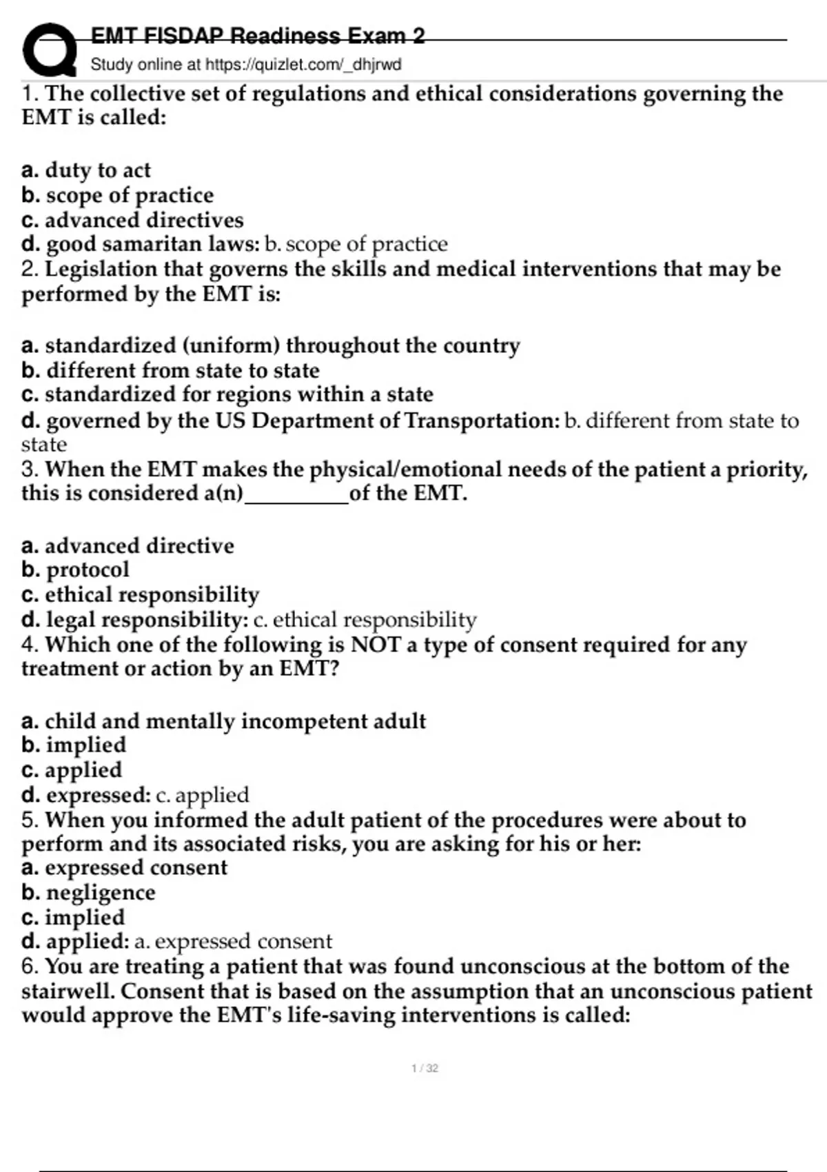 Get exam-ready with this 162-question FISDAP Readiness Exam 2 PDF designed for EMT students and NREMT prep. Topics include scene size-up, legal/ethical care, trauma, airway management, pharmacology, mental status assessments (AVPU), and clinical reasoning. Ideal for classroom review or certification practice.