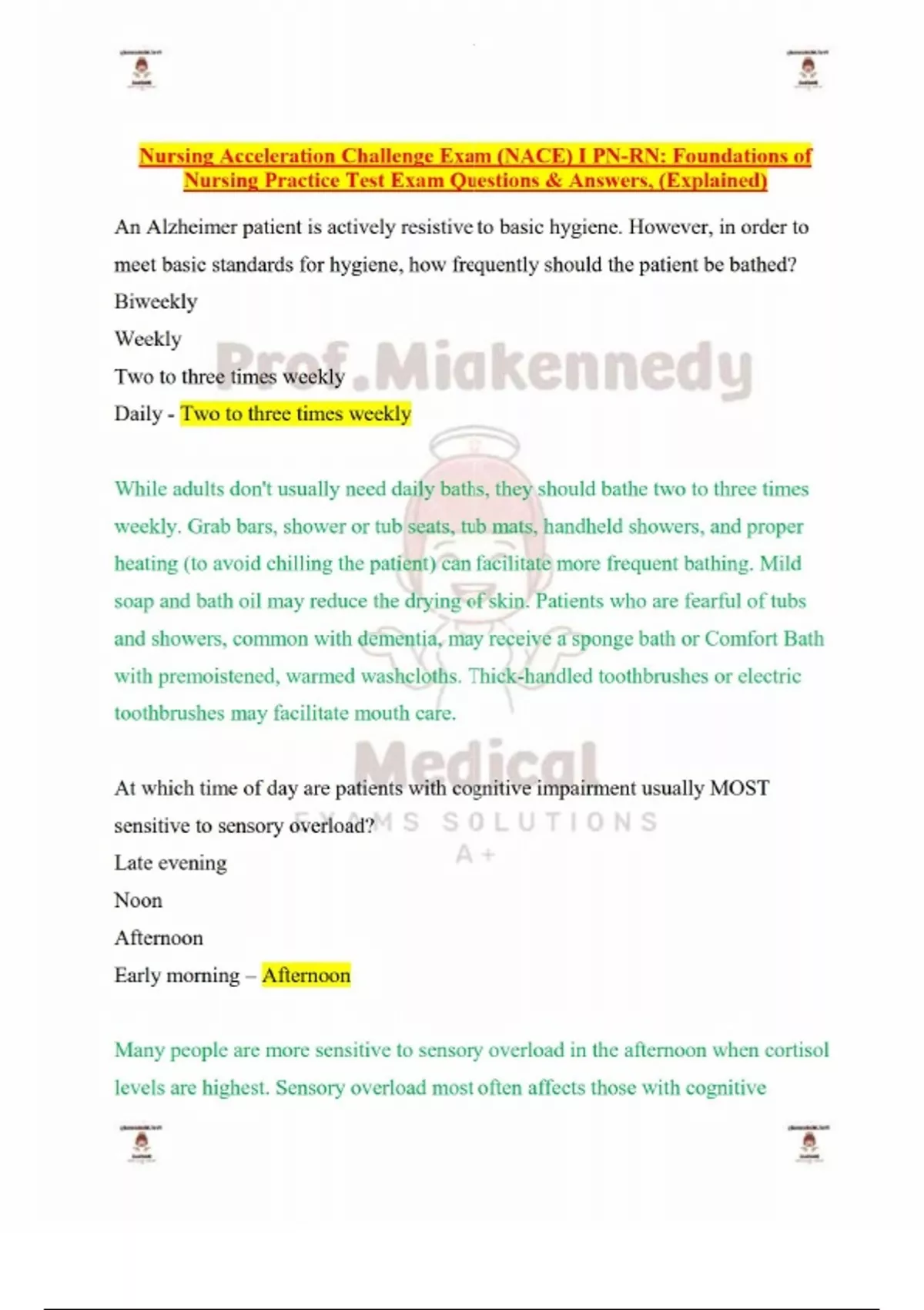 Nursing Acceleration Challenge Exam (NACE), PN-RN, Foundations of Nursing Practice Test Exam Questions & Answers, (Explained)-An Alzheimer patient is actively resistive to basic hygiene. However, in order to meet basic standards for hygiene, how frequently should the patient be bathed? Biweekly Weekly Two to three times weekly Daily - Two to three times weekly While adults don't usually need daily baths, they should bathe two to three times weekly. Grab bars, shower or tub seats, tub mats, handheld showers, and proper heating (to avoid chilling the patient) can facilitate more frequent bathing. Mild soap and bath oil may reduce the drying of skin. Patients who are fearful of tubs and showers, common with dementia, may receive a sponge bath or Comfort Bath with premoistened, warmed washcloths. Thick-handled toothbrushes or electric toothbrushes may facilitate mouth care. At which time of day are patients with cognitive impairment usually MOST sensitive to sensory overload? Late evening Noon Afternoon Early morning – Afternoon Many people are more sensitive to sensory overload in the afternoon when cortisol levels are highest. Sensory overload most often affects those with cognitive impairment or those in stressful situations. Excess noise and activity can cause distress, agitation, confusion, and delirium. Sensory deprivation occurs when there is too little environmental stimulation because of reduction in sensory input because of hearing or vision deficits, inability to recognize sensory input because of cognitive impairment, or a boring environment. Sensory deprivation can contribute to confusion, disorientation, and depression. Which of the following is characteristic of nociceptive pain? Burning, stabbing, or shooting pains Diffuse or cramping pain Acute aching or throbbing pain localized to the site of injury Association with chronic conditions such as diabetes or cancer - Acute aching or throbbing pain localized to the site of injury Nociceptive pain usually correlates with the extent and type of injury: the greater the injury, the greater the pain. It may be procedural pain (related to wound manipulation and dressing changes) or surgical pain (related to the cutting of tissue). It may also be continuous or cyclic, depending upon the type of injury. This type of pain, often described as aching or throbbing, is usually localized to the area of injury and resolves over time as healing takes place, and it usually responds to analgesia. According to the three-step World Health Organization (WHO) "analgesic ladder," a patient complaining of moderate to severe pain unresponsive to NSAIDs may require which of the following medications? Morphine Demerol Codeine Acetaminophen - Codeine Step 1: Mild to moderate pain is treated with aspirin, acetaminophen, and NSAIDs. Step 2: Moderate to severe pain unrelieved by Step 1 medications may need opioids, such as codeine, tramadol, or Percocet. Step 3: Severe pain without relief from Step 1 or Step 2 medications may need stronger opioids, such as morphine, Dilaudid, or MS-Contin