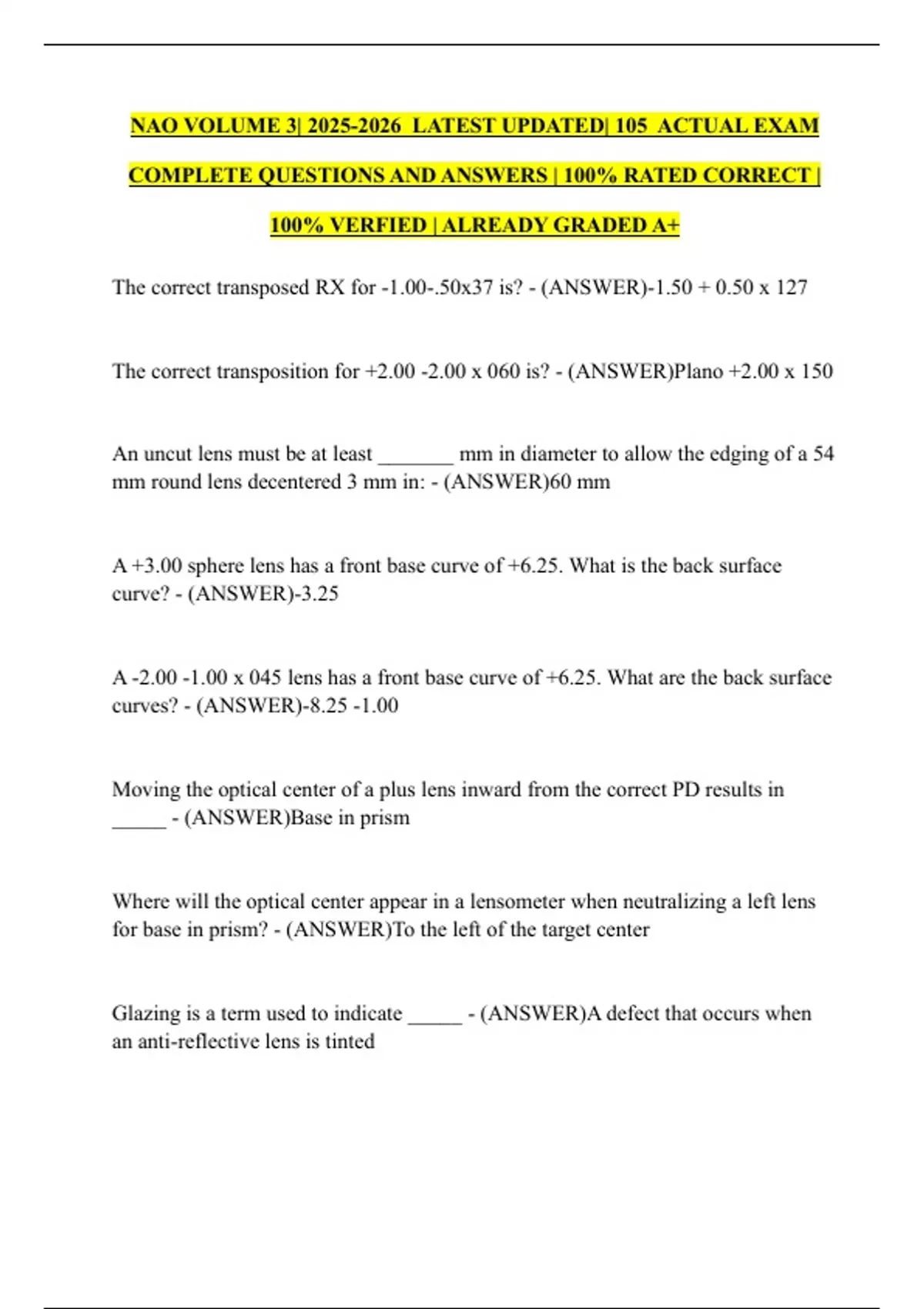 NAO VOLUME 3| LATEST UPDATED| 105 ACTUAL EXAM COMPLETE QUESTIONS AND ANSWERS | 100% RATED CORRECT | 100% VERFIED | ALREADY GRADED A+